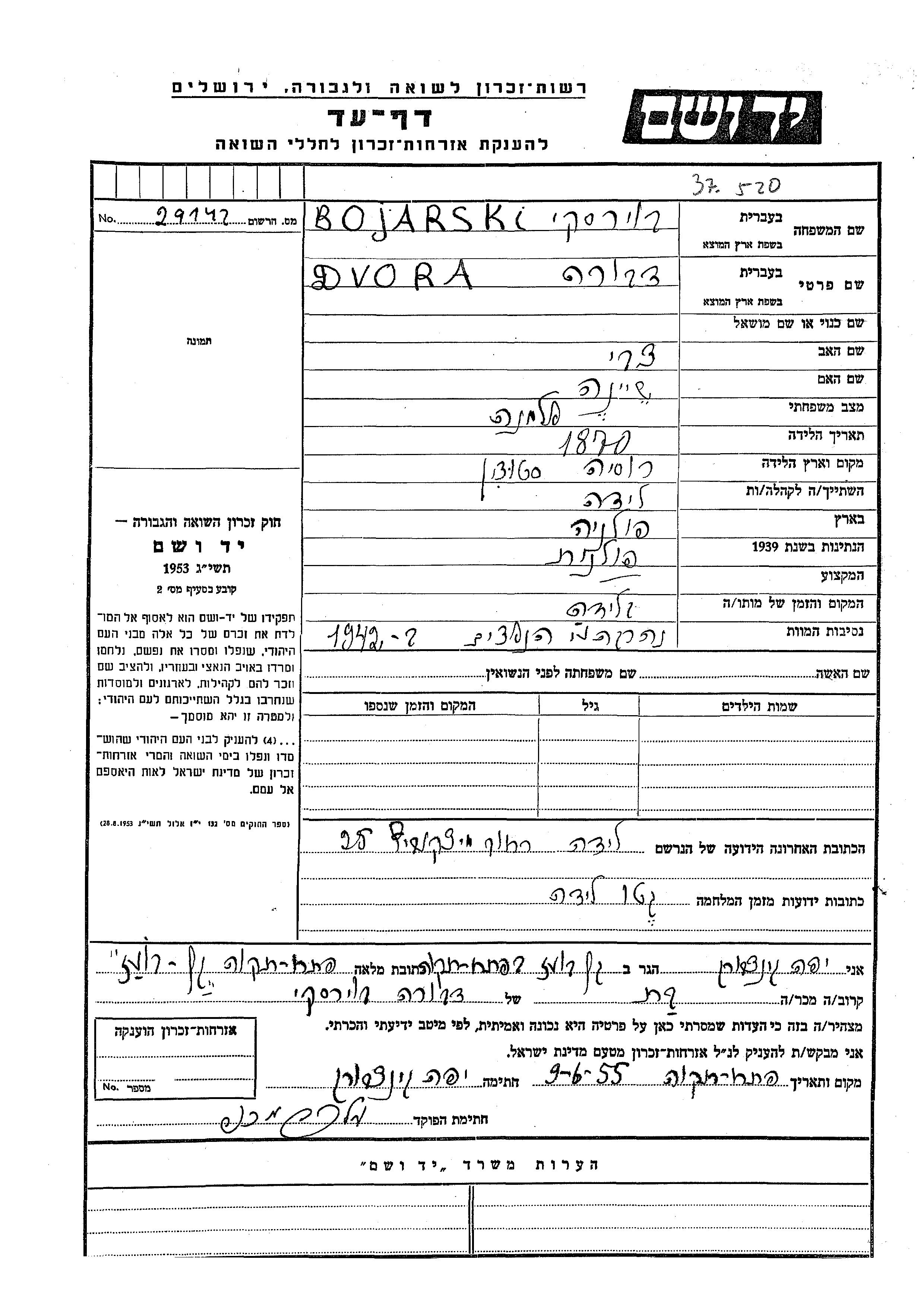 Dvora Bojarski est née à Stuczyn, Pologne en 1870, fille de Tzvi et de Sheina. Avant la seconde guerre mondiale elle vivait à Lida, Pologne. Pendant la guerre, elle était à Lida, Pologne.