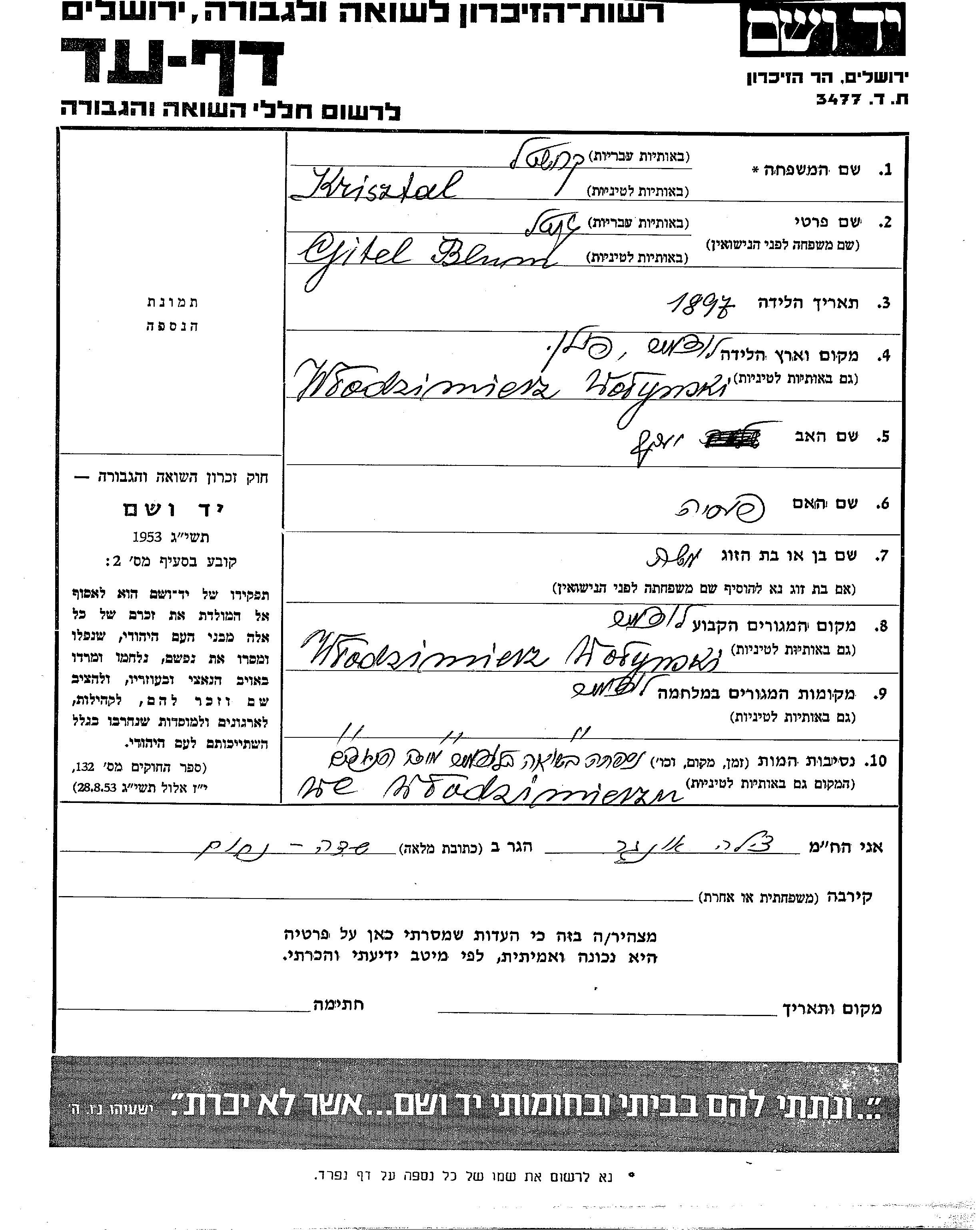 Krisztal Gitel 1897 Wlodzimierz Wolynski, Pologne Feuille de témoignage
