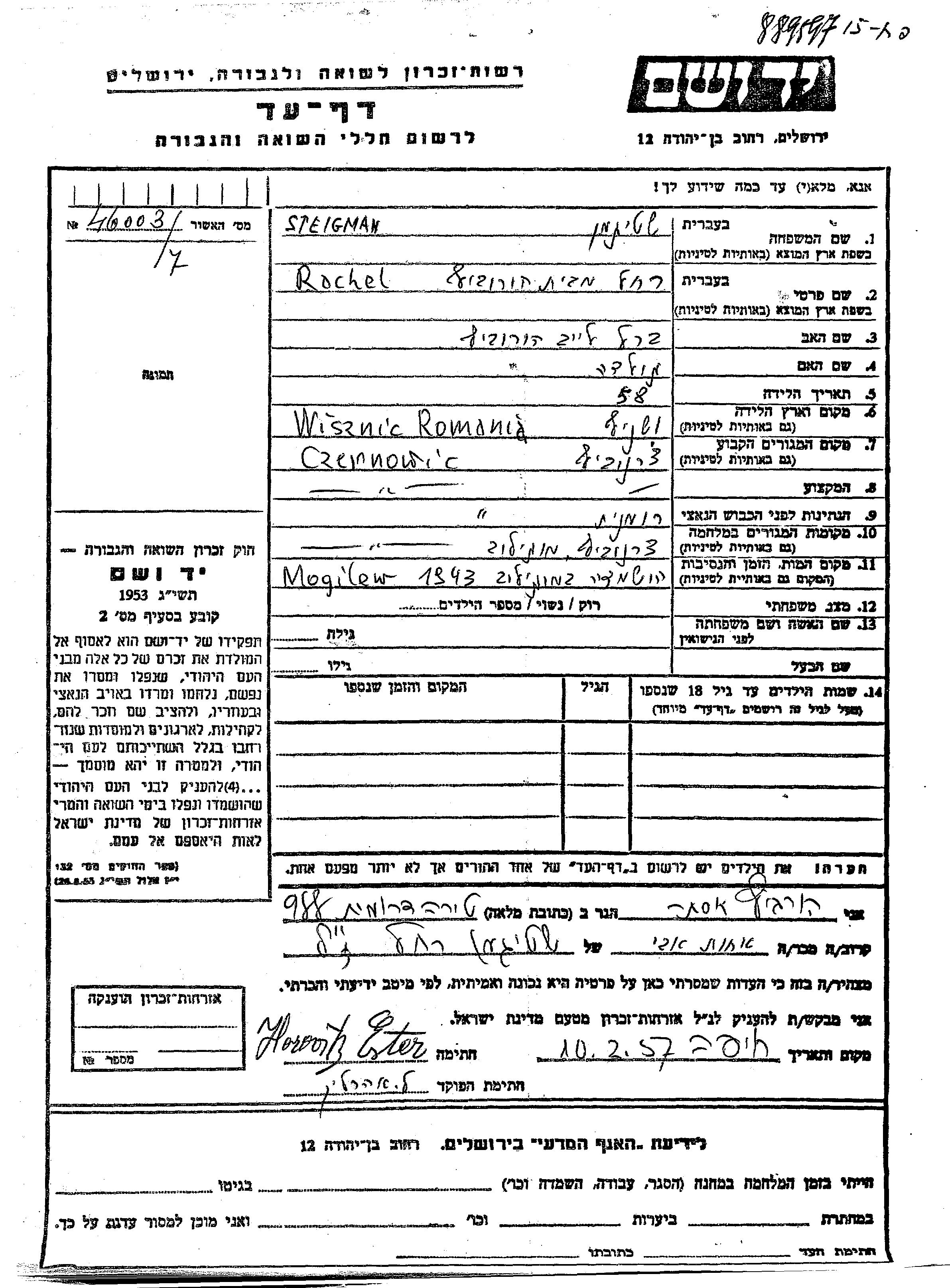 Steigman Rochel Czernowitz, Roumanie Feuille de témoignage