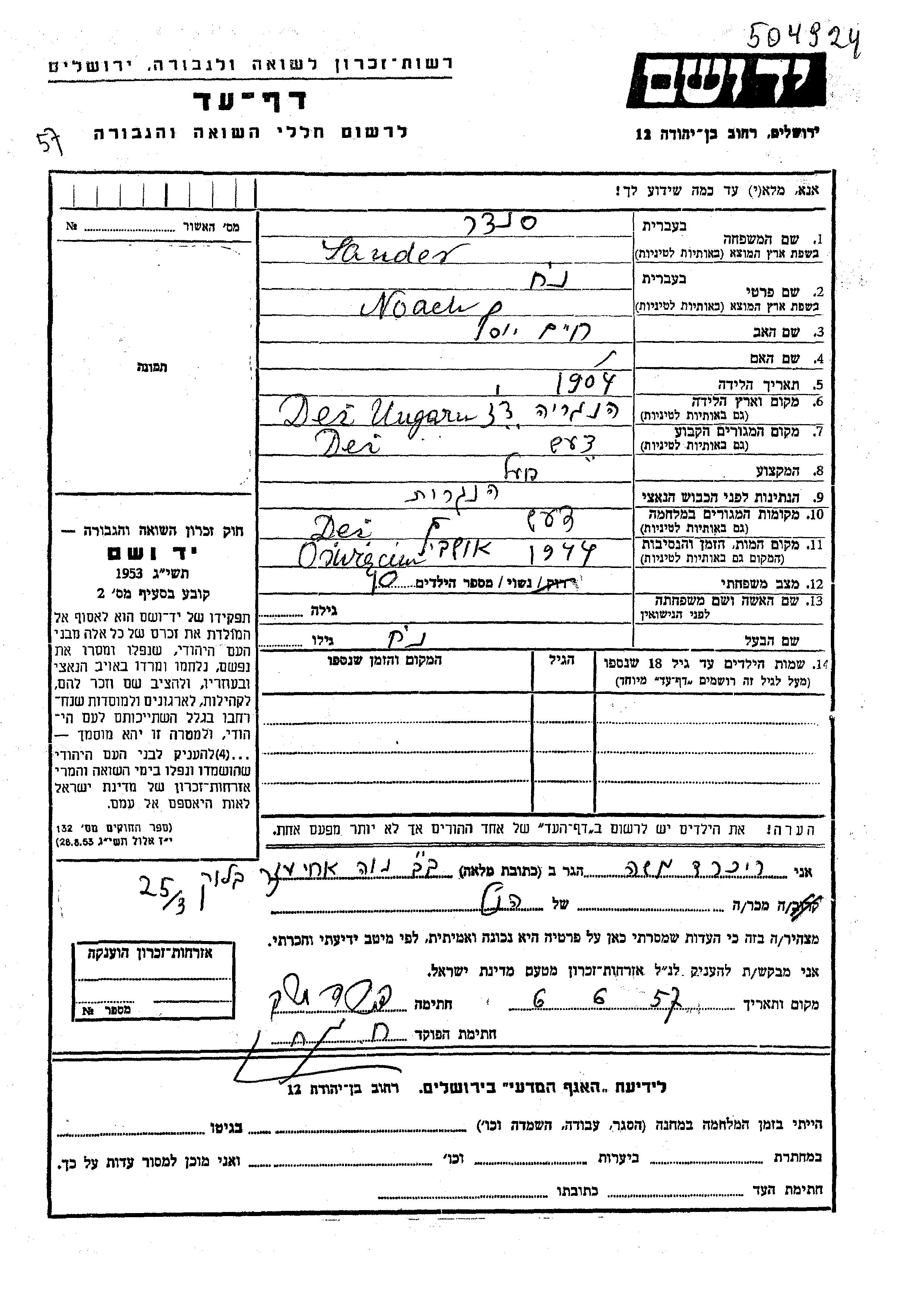 Sander Sender Noach 1904 Dez, Roumanie Feuille de témoignage