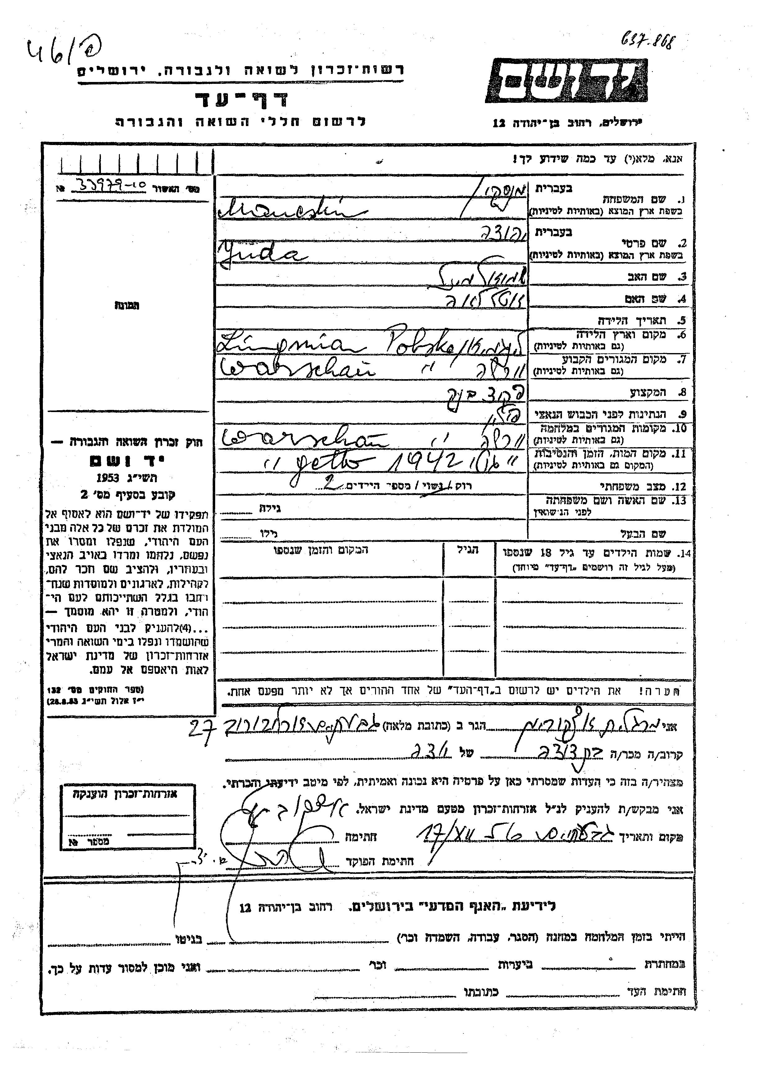 Yad Vashem - Pages of Testimony Names Memorial Collection