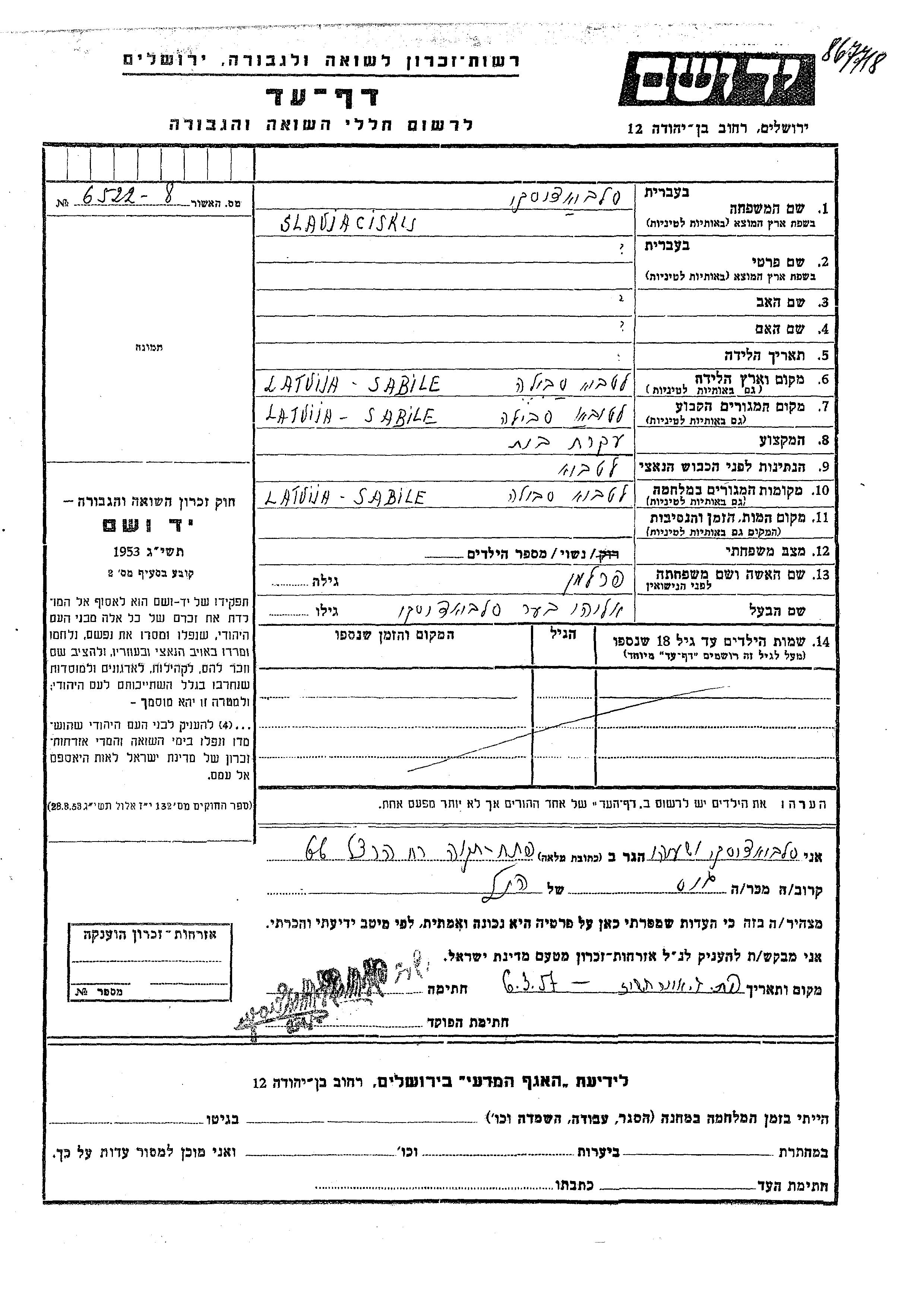 Slaviaciski prénom inconnu Sabile, Lettonie Feuille de témoignage