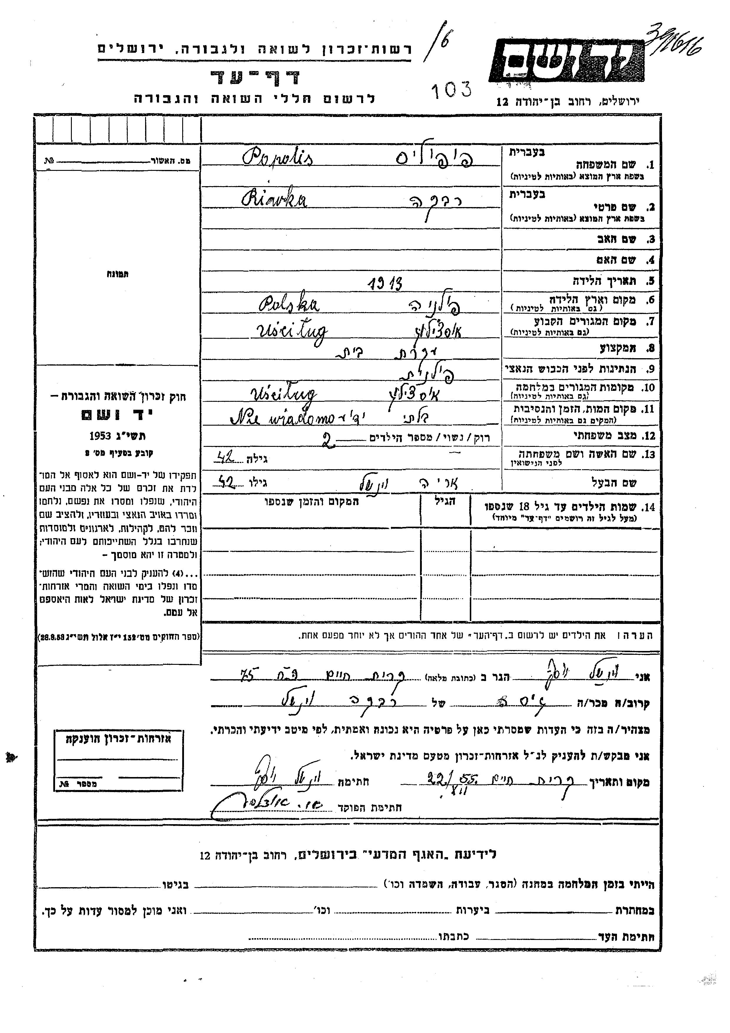 Riwka Veinshel née Popolis est née à Pologne en 1913. Elle était Femme au foyer et Mariée à Arie. Avant la seconde guerre mondiale elle vivait à Uscilug, Pologne. Pendant la guerre, elle était à Uscilug, Pologne.