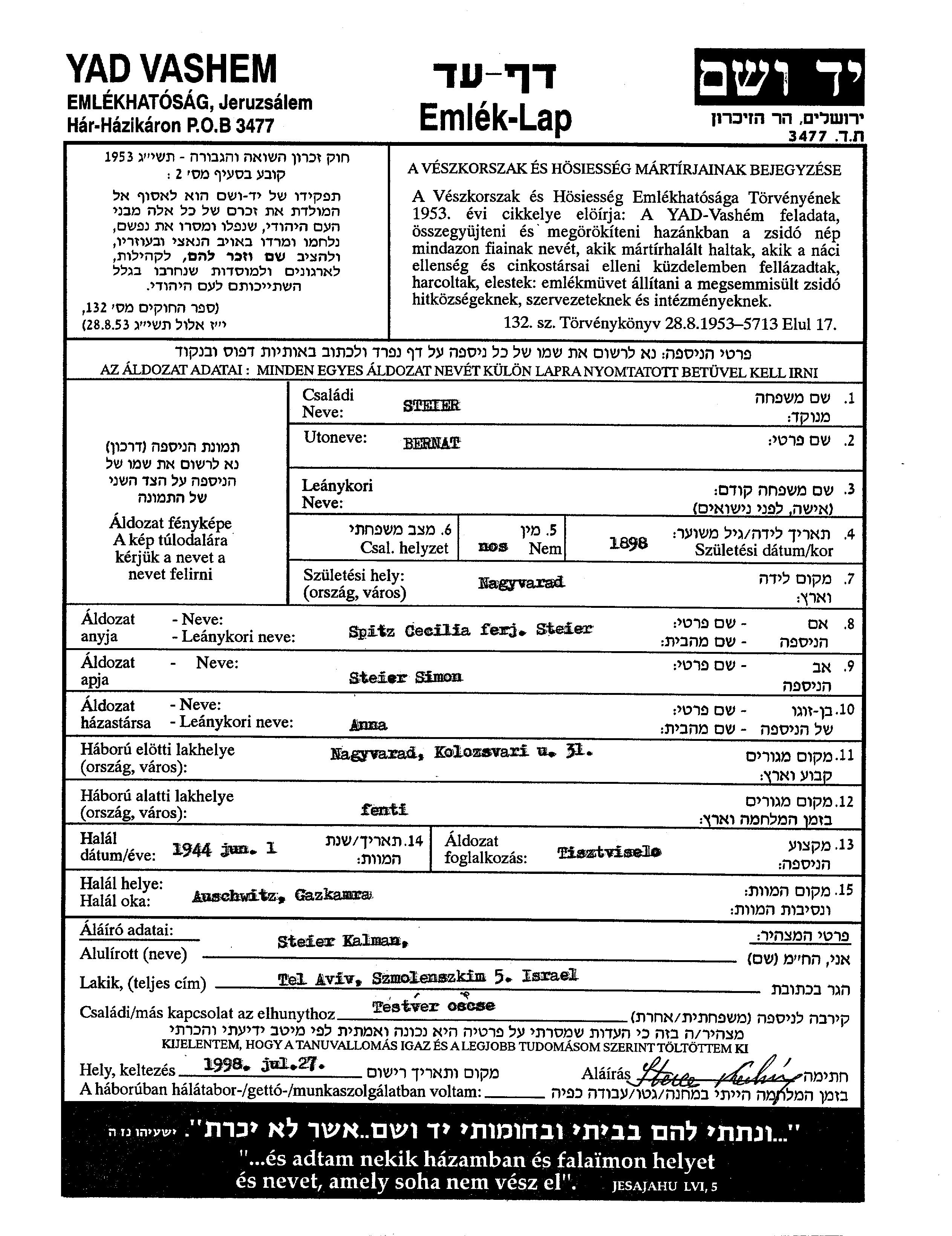 Steier Bernat 1898 Nagyvarad, Roumanie Feuille de témoignage