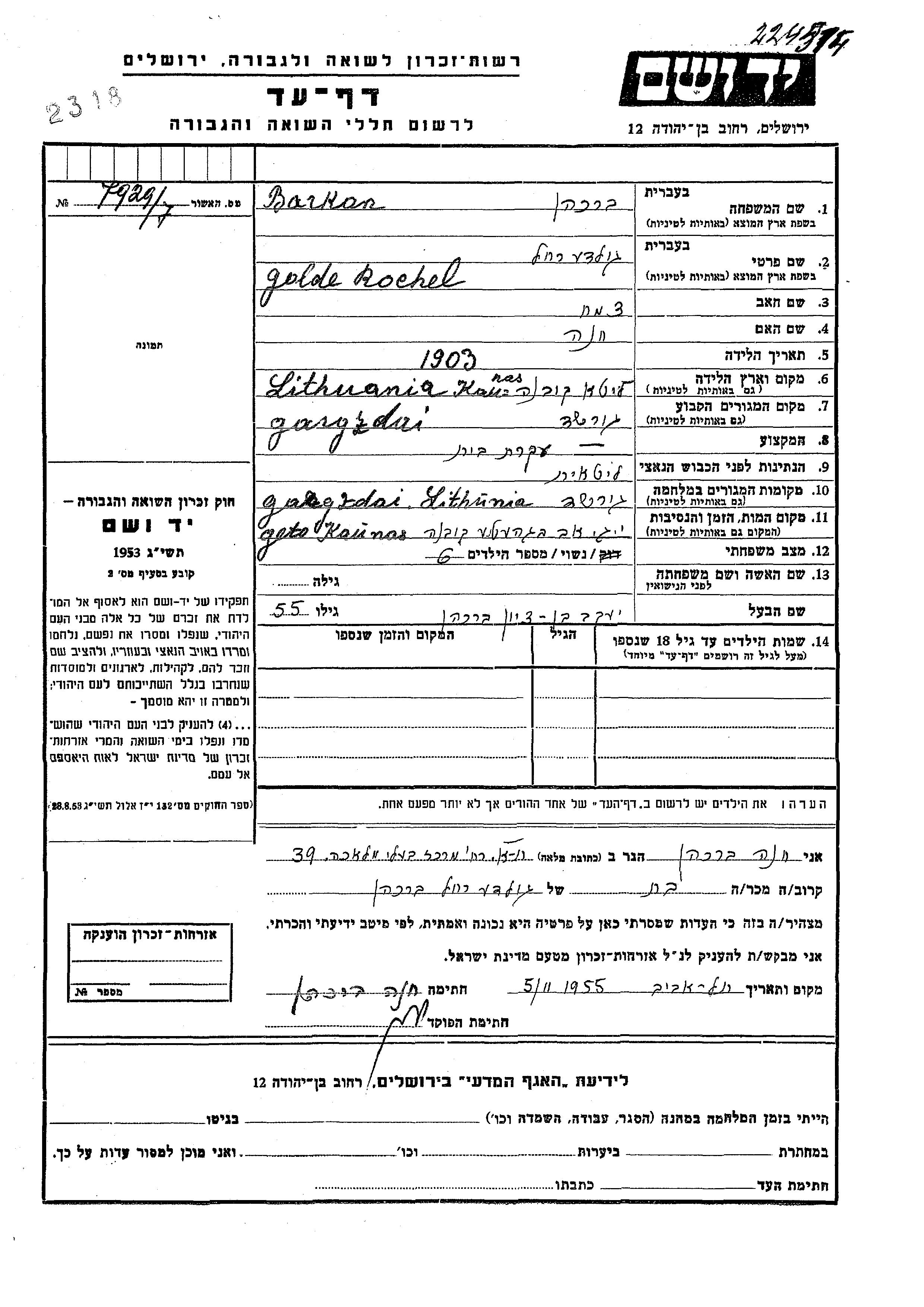 Barkan Golda Rochel 1903 Gargždai, Lituanie Feuille de témoignage