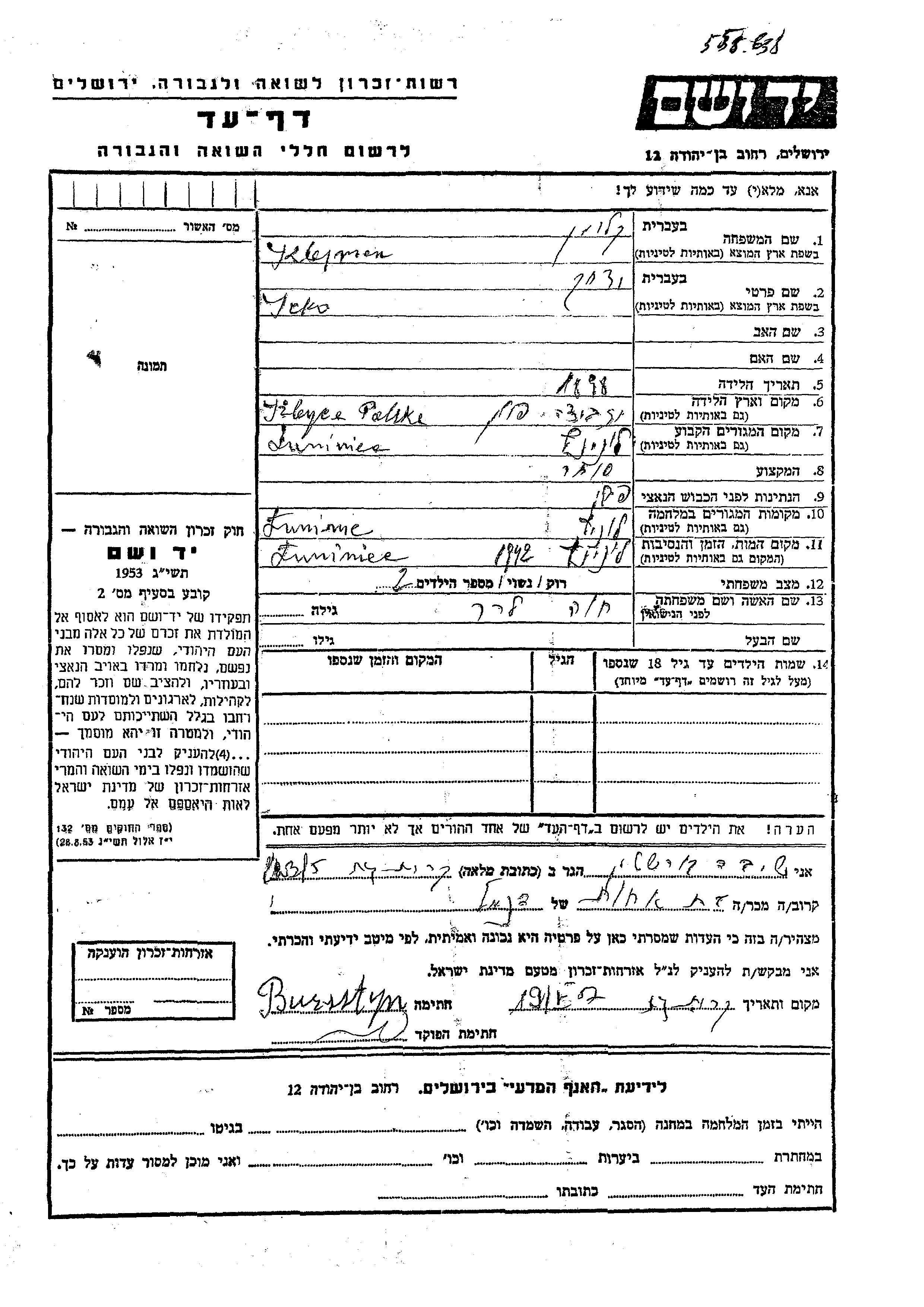 Yad Vashem - Pages of Testimony Names Memorial Collection