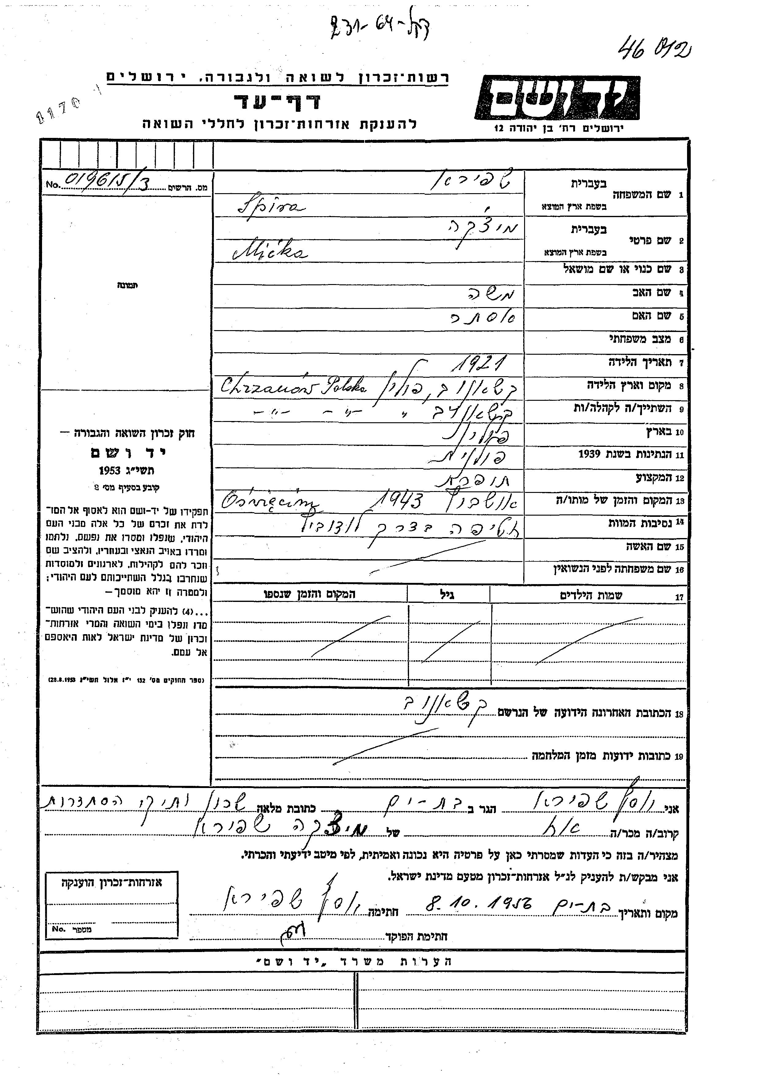 Spira Micka Miriam 1921 Chrzanow, Pologne Feuille de témoignage