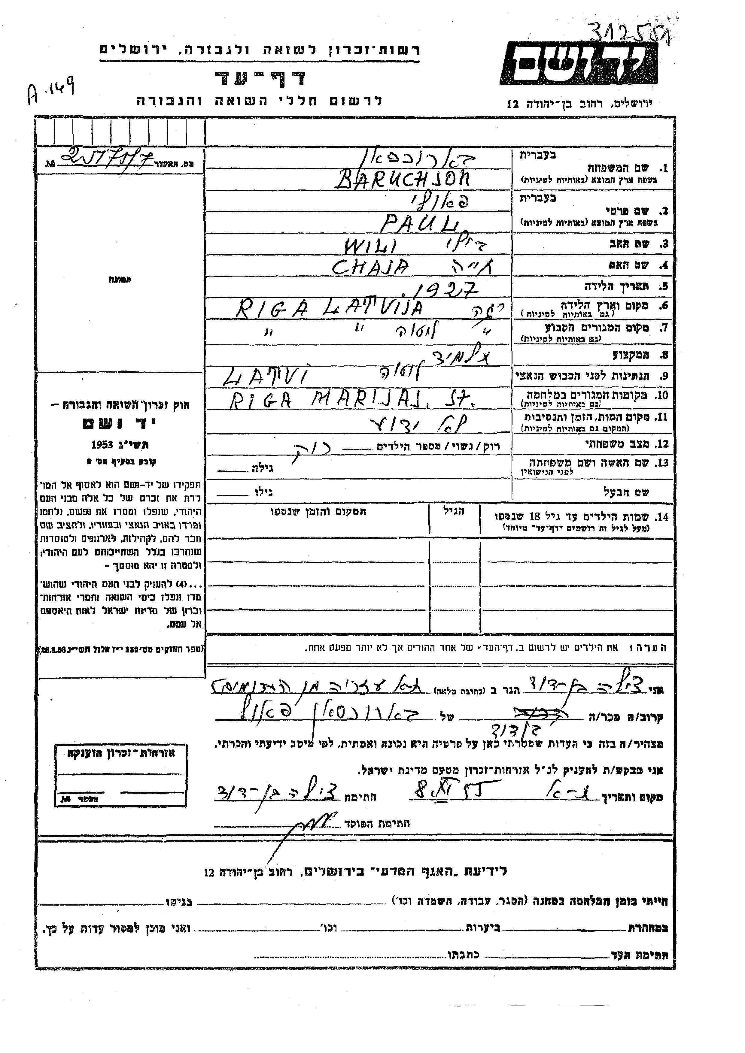 Baruchson Paul 1927 Riga, Lettonie Feuille de témoignage