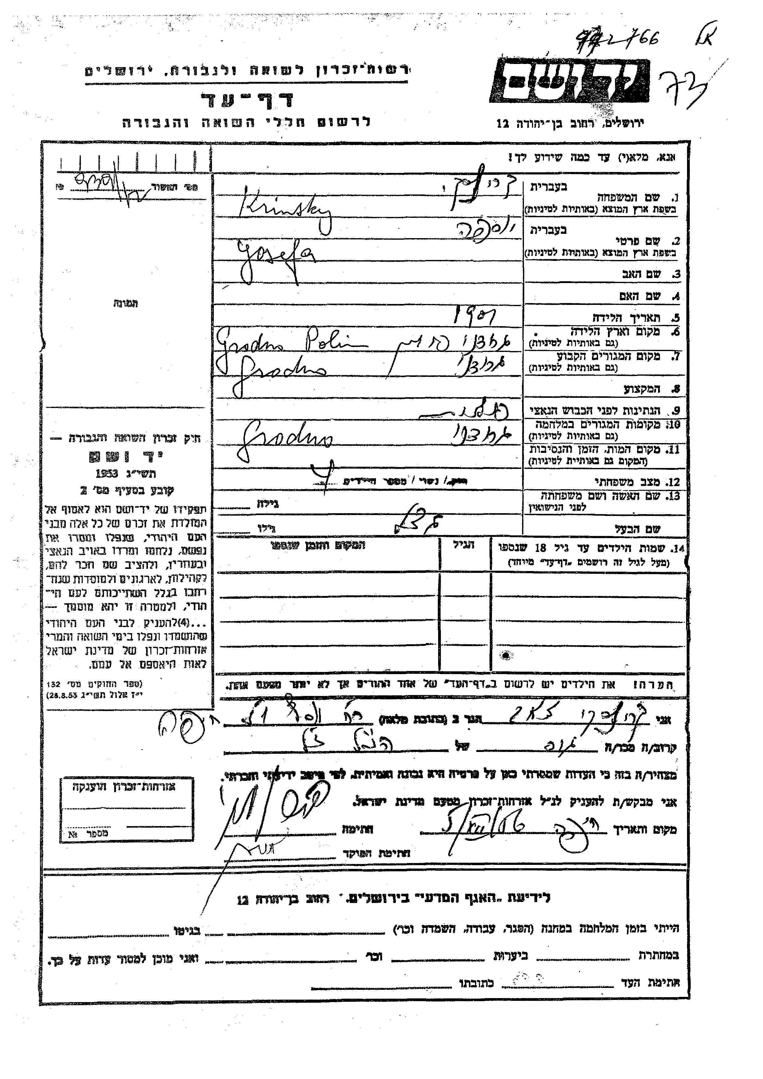 Krinsky Yosefa 1901 Grodno, Pologne Feuille de témoignage
