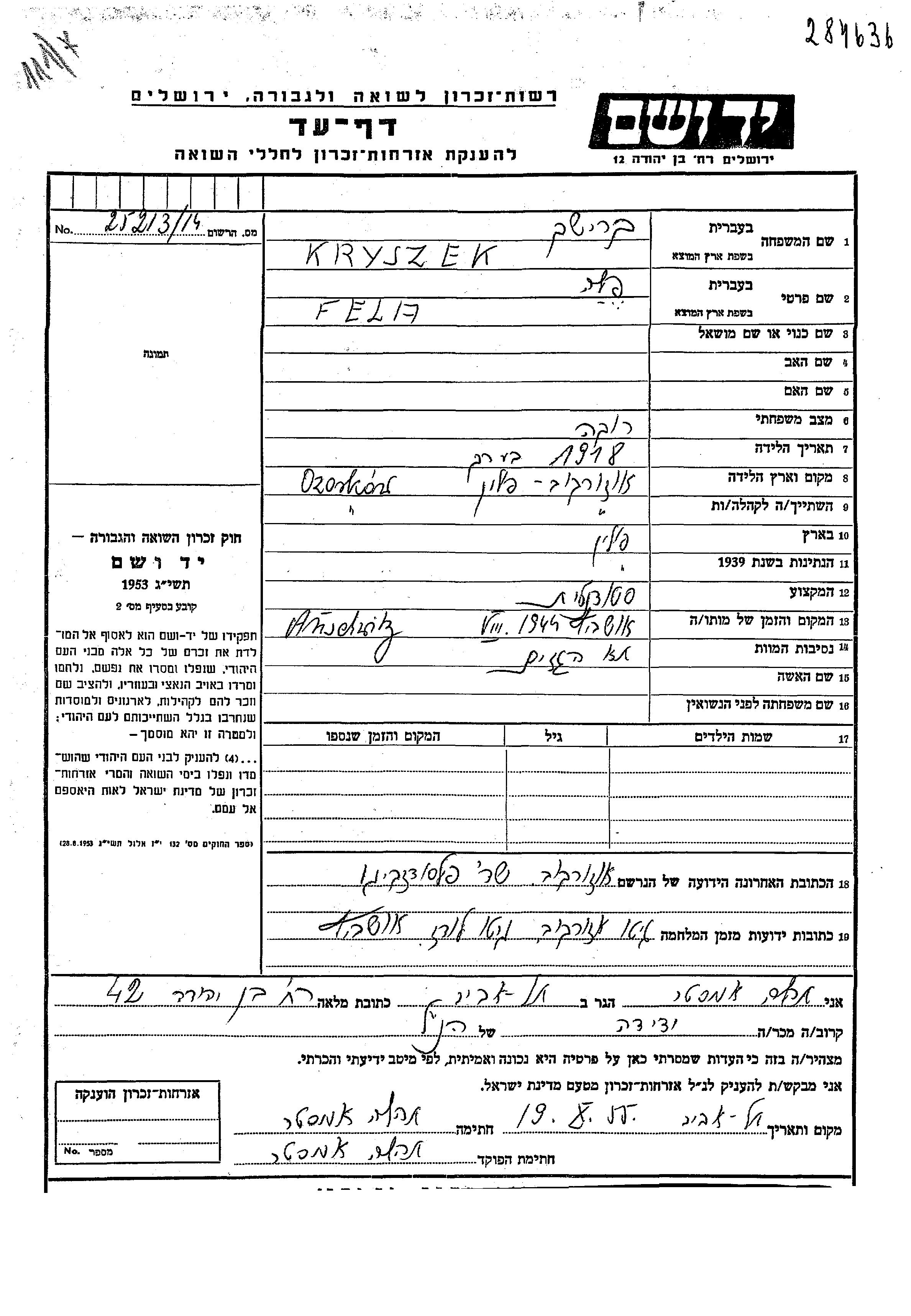 Kryszek Fela 1918 Ozorkov, Pologne Feuille de témoignage