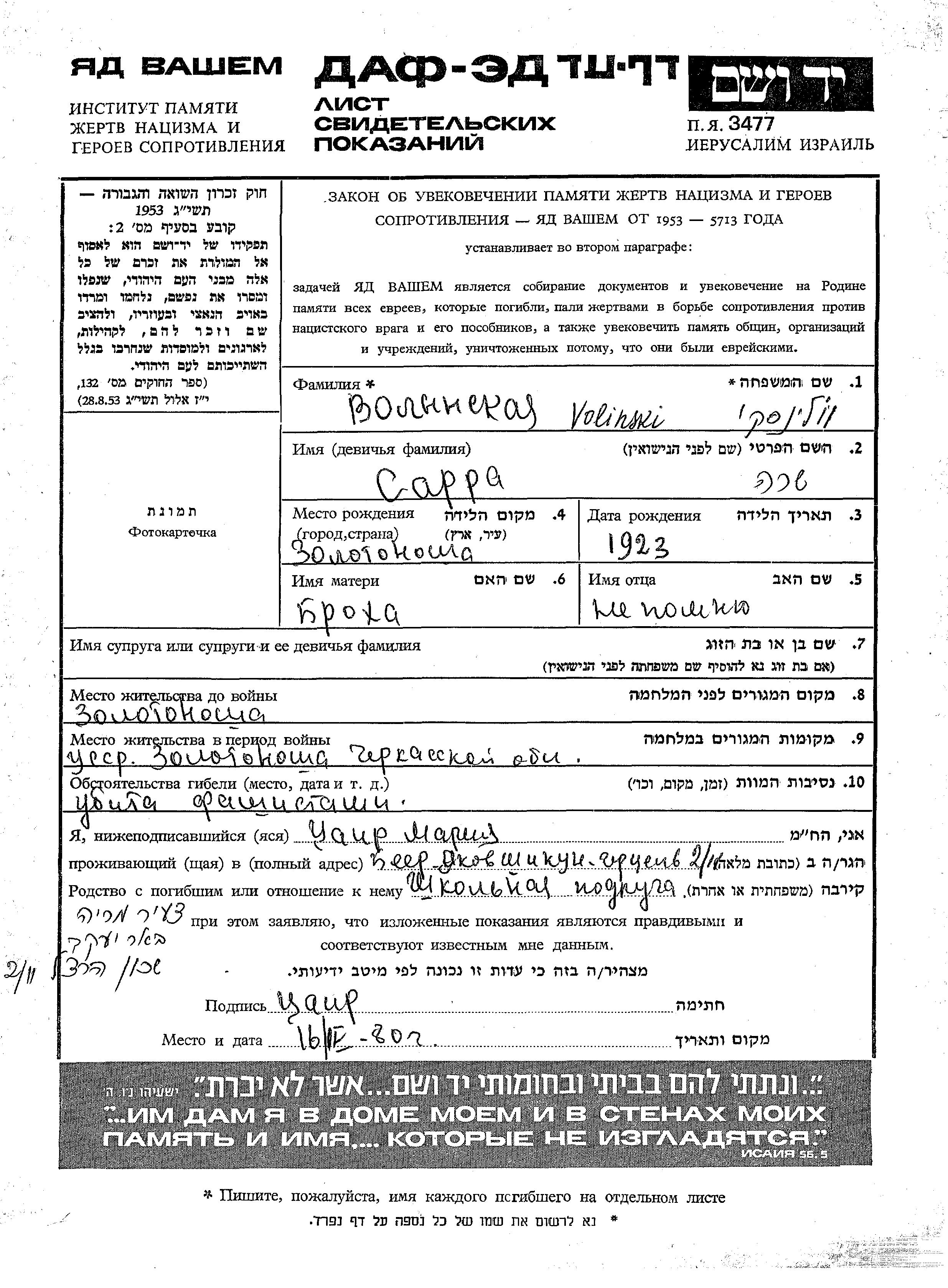 Volinski Sarra 1923 Zolotonosha, Ukraine (URSS) Feuille de témoignage