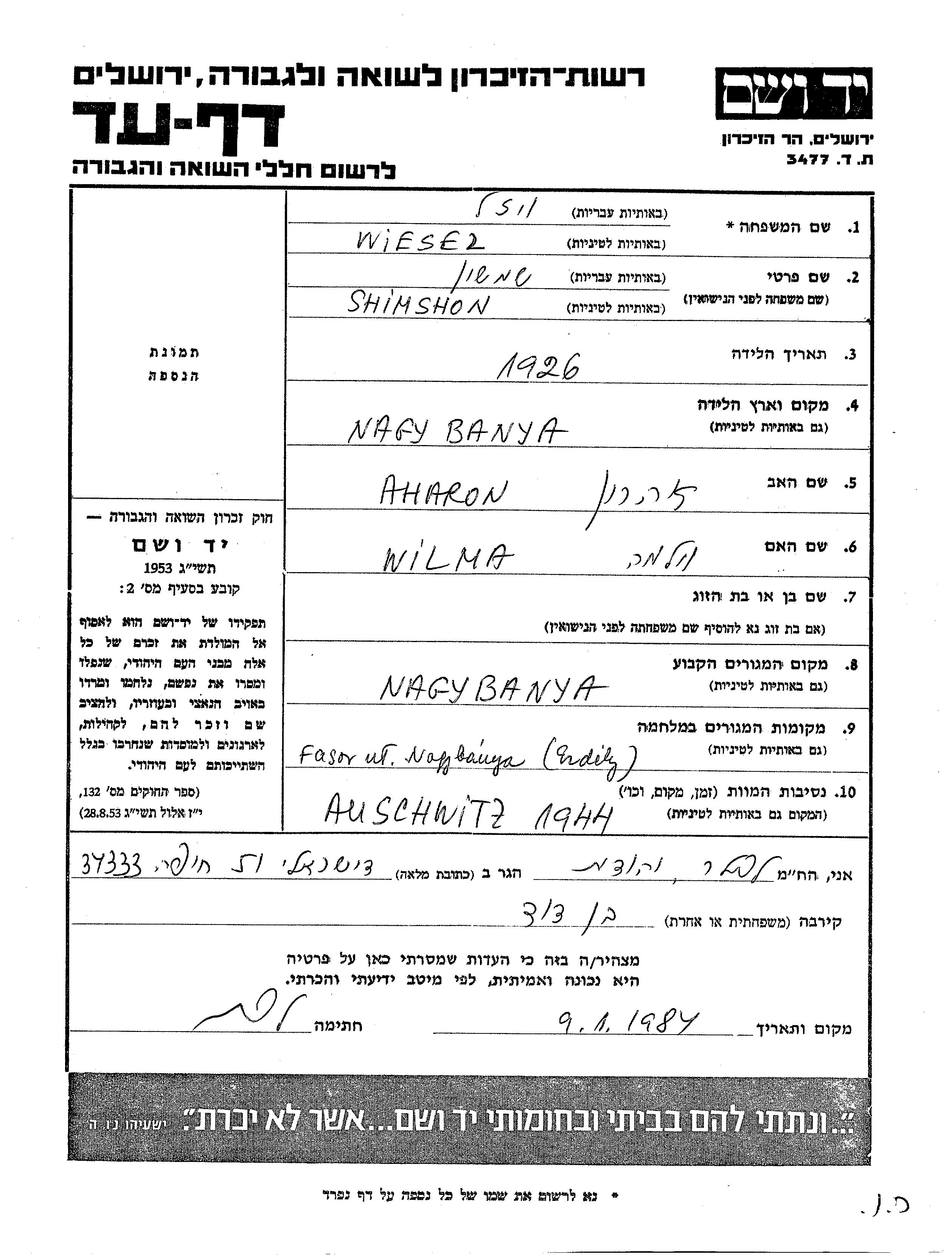 Wiesel Shimshon 1926 Nagy Banya, Roumanie Feuille de témoignage