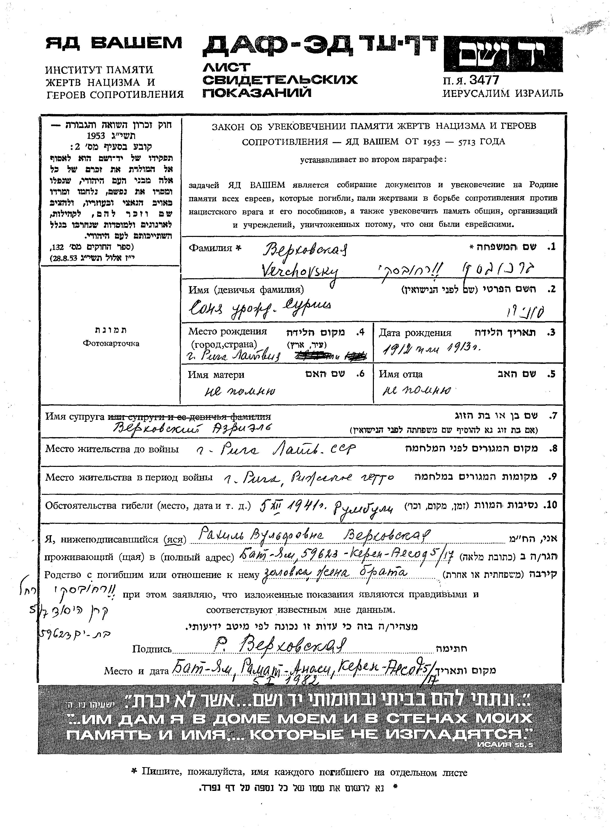 Sonya Verchovsky née Suritz est née à Riga, Lettonie en 1912. Elle était Mariée à Azriel. Avant la seconde guerre mondiale elle vivait à Riga, Lettonie. Pendant la guerre, elle était à Riga, Lettonie.