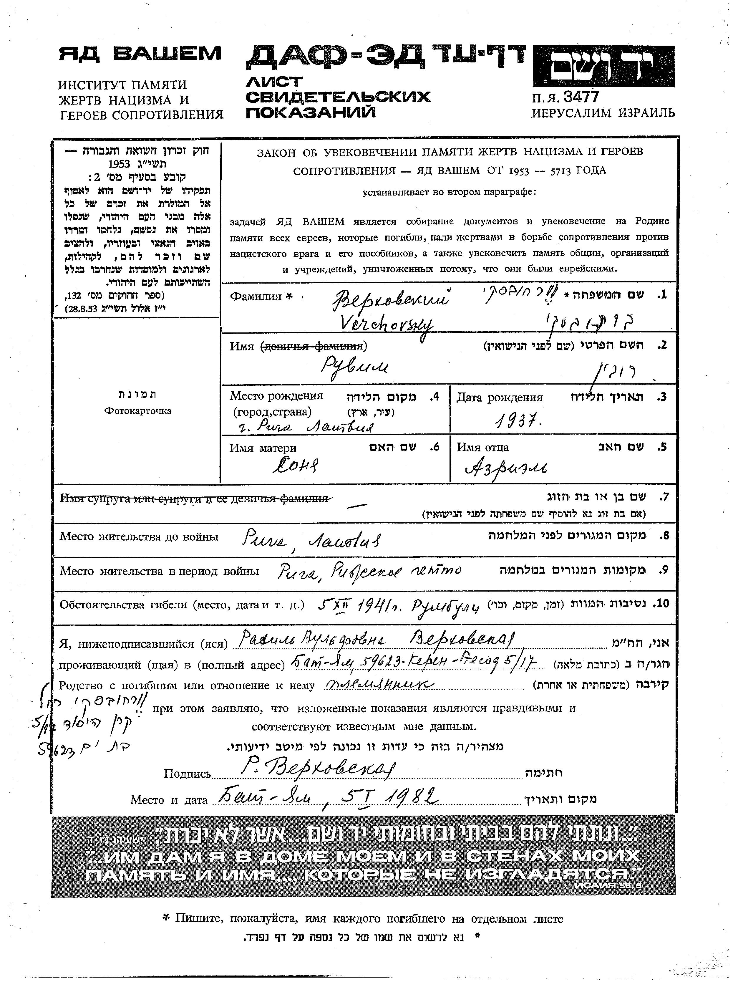 Verchovsky Ruvim 1937 Riga, Lettonie Feuille de témoignage