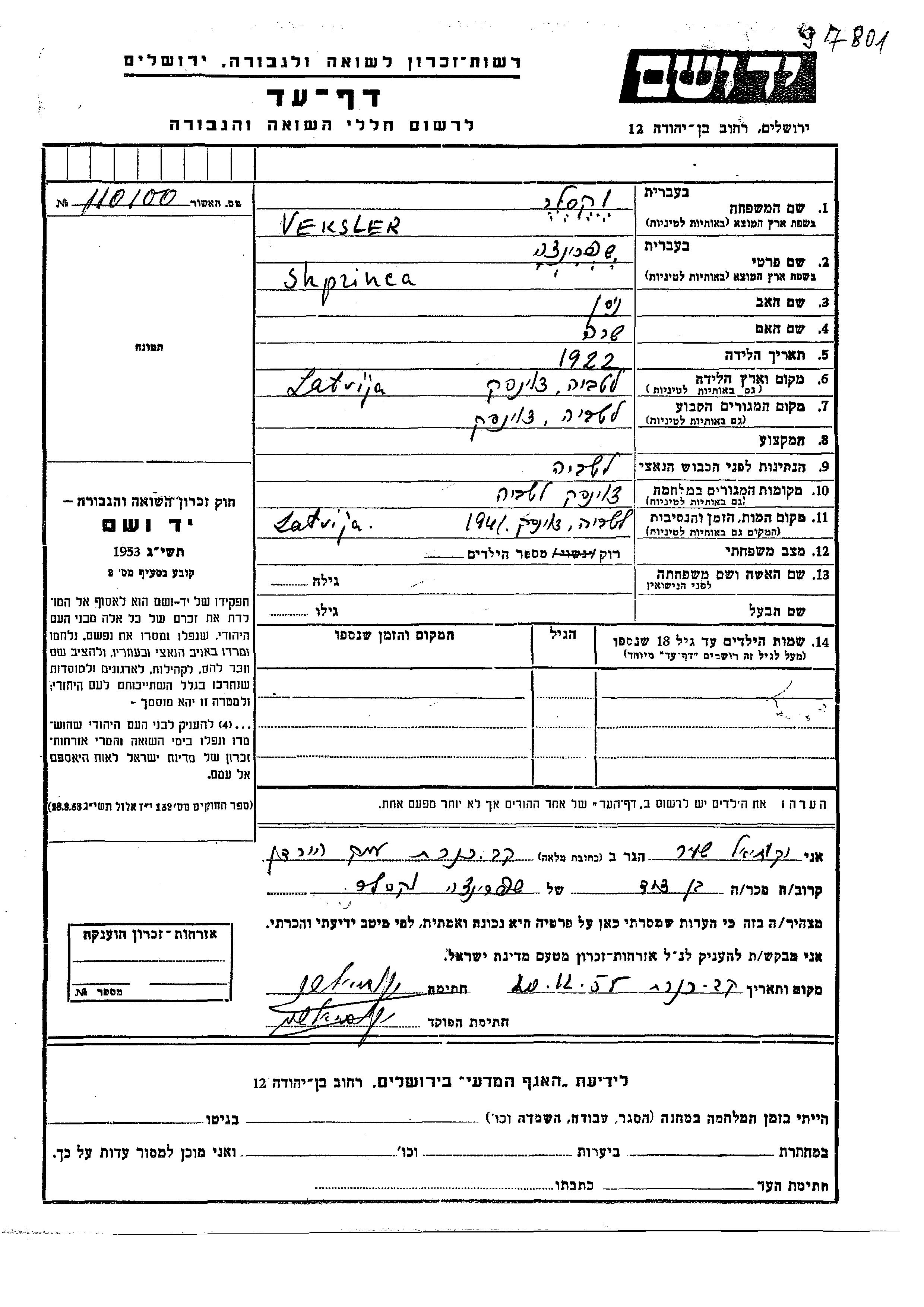 Shprinca Veksler est née à Lettonie en 1922, fille de Nisan et de Sara. Elle était Célibataire. Avant la seconde guerre mondiale elle vivait à Lettonie. Pendant la guerre, elle était à Lettonie.
