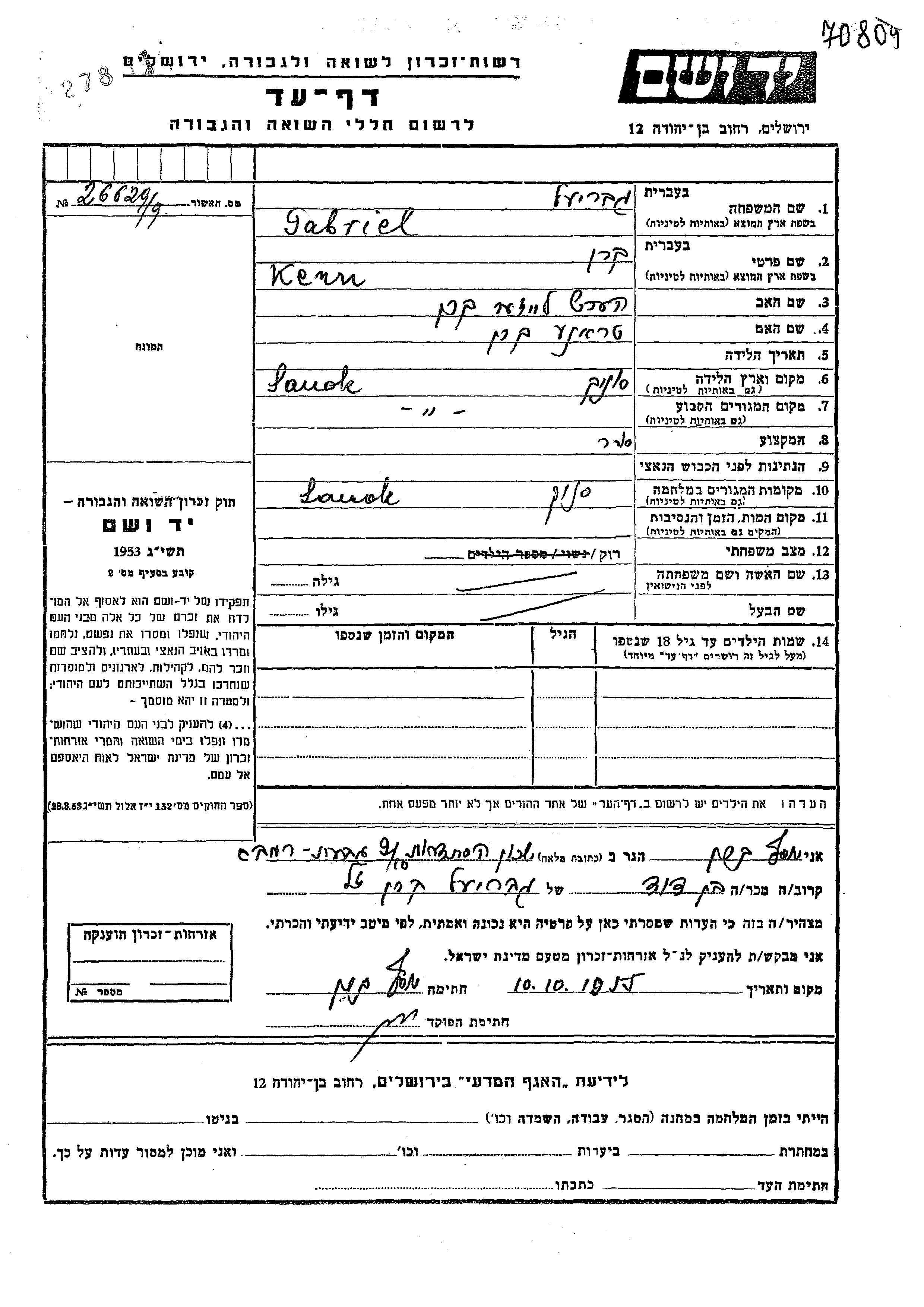 Yad Vashem - Pages of Testimony Names Memorial Collection