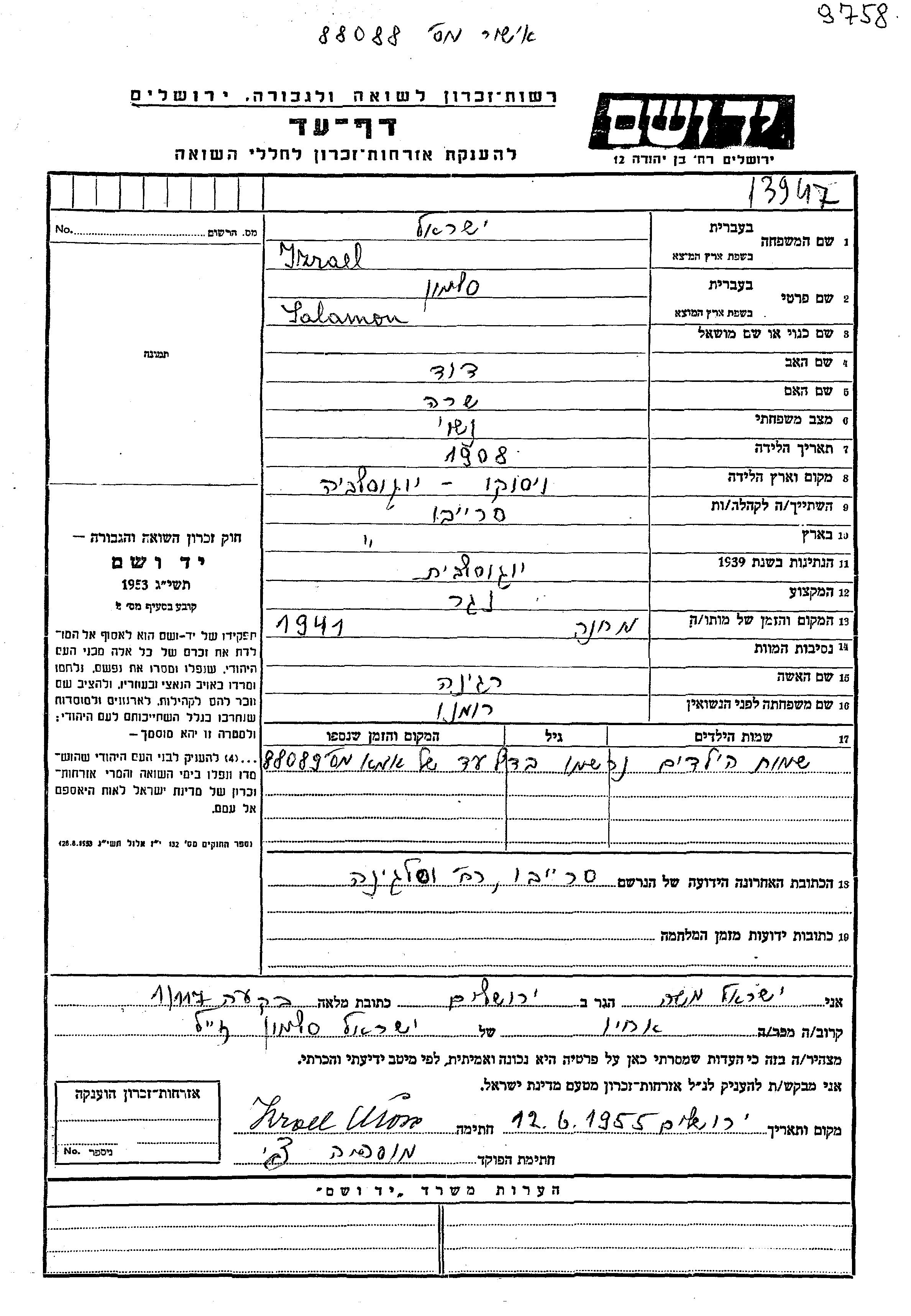 Izrael Salomon 1908 Sarajevo, Yugoslavie Feuille de témoignage