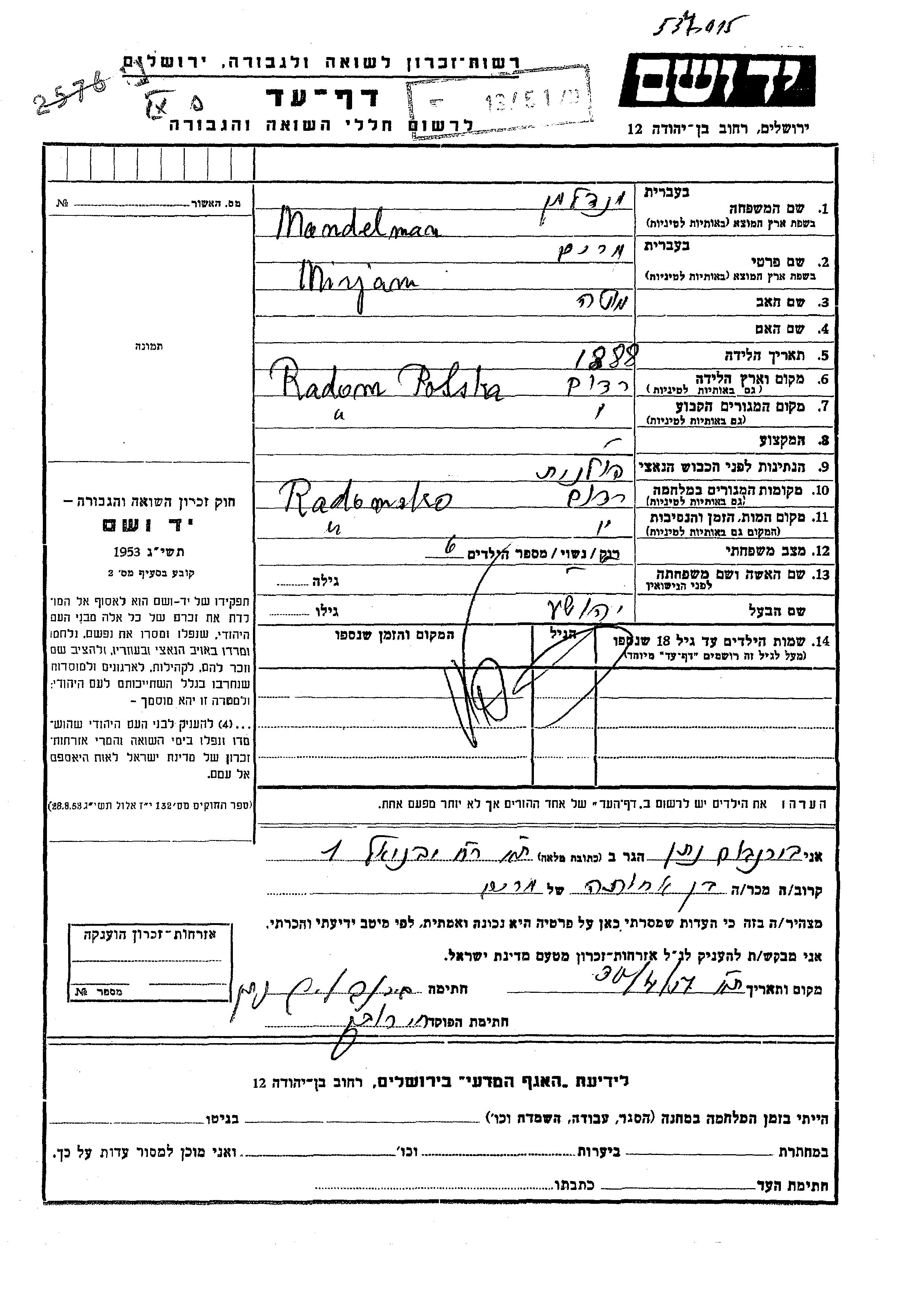 Mandelman Mirjam 1888 Radom, Pologne Feuille de témoignage