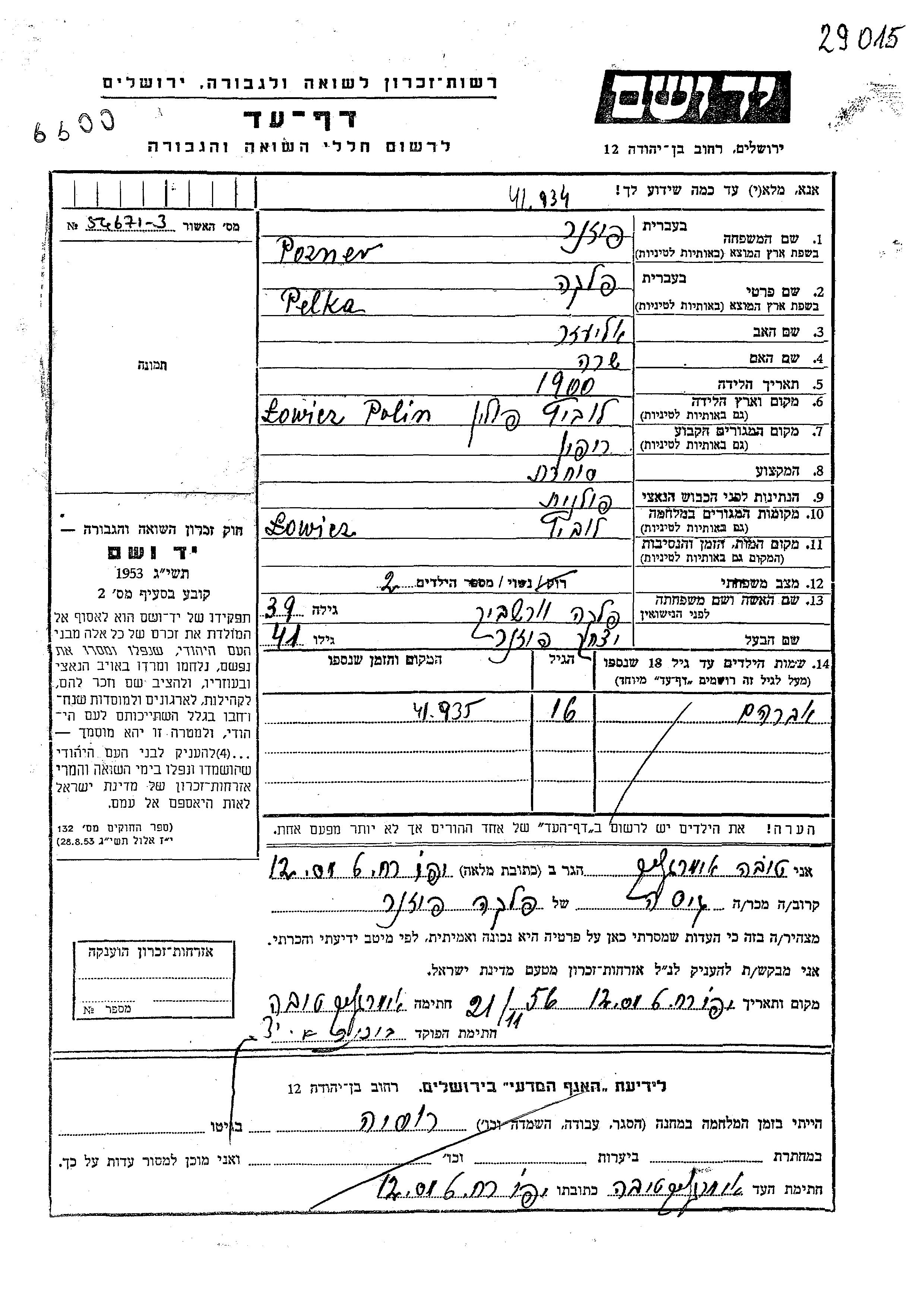 Pelka Pozner née Varshavyak est née à Lowicz, Pologne en 1900, fille de Eliezer et de Sara. Elle était Commerçant/e et Mariée à Yitzkhak. Avant la seconde guerre mondiale elle vivait à Rypin, Pologne. Pendant la guerre, elle était à Lowicz, Pologne.
