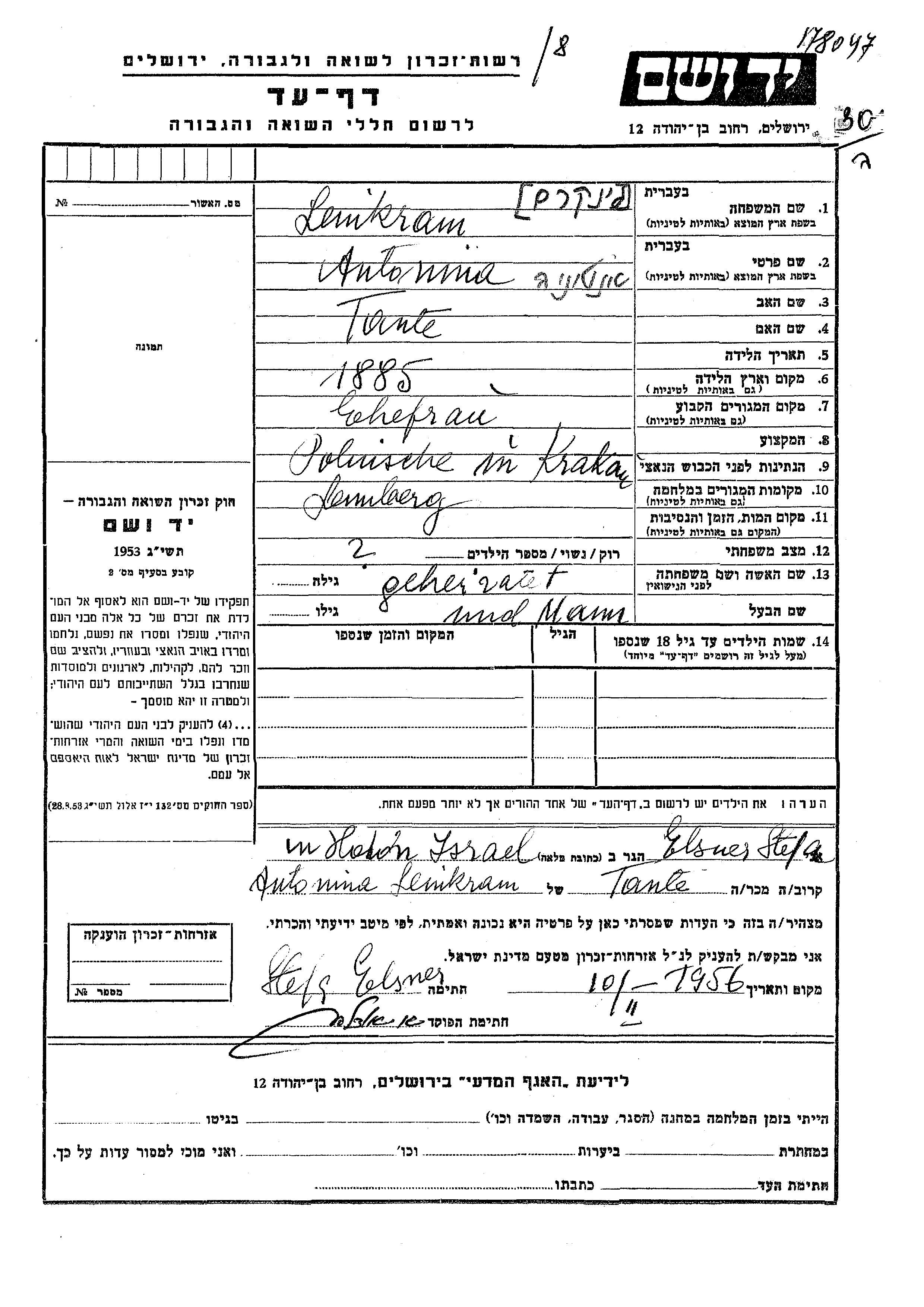 Antonina Leinkram est née en 1885. Elle était Femme au foyer et Mariée. Avant la seconde guerre mondiale elle vivait à Krakow, Pologne. Pendant la guerre, elle était à Lemberg, Pologne.