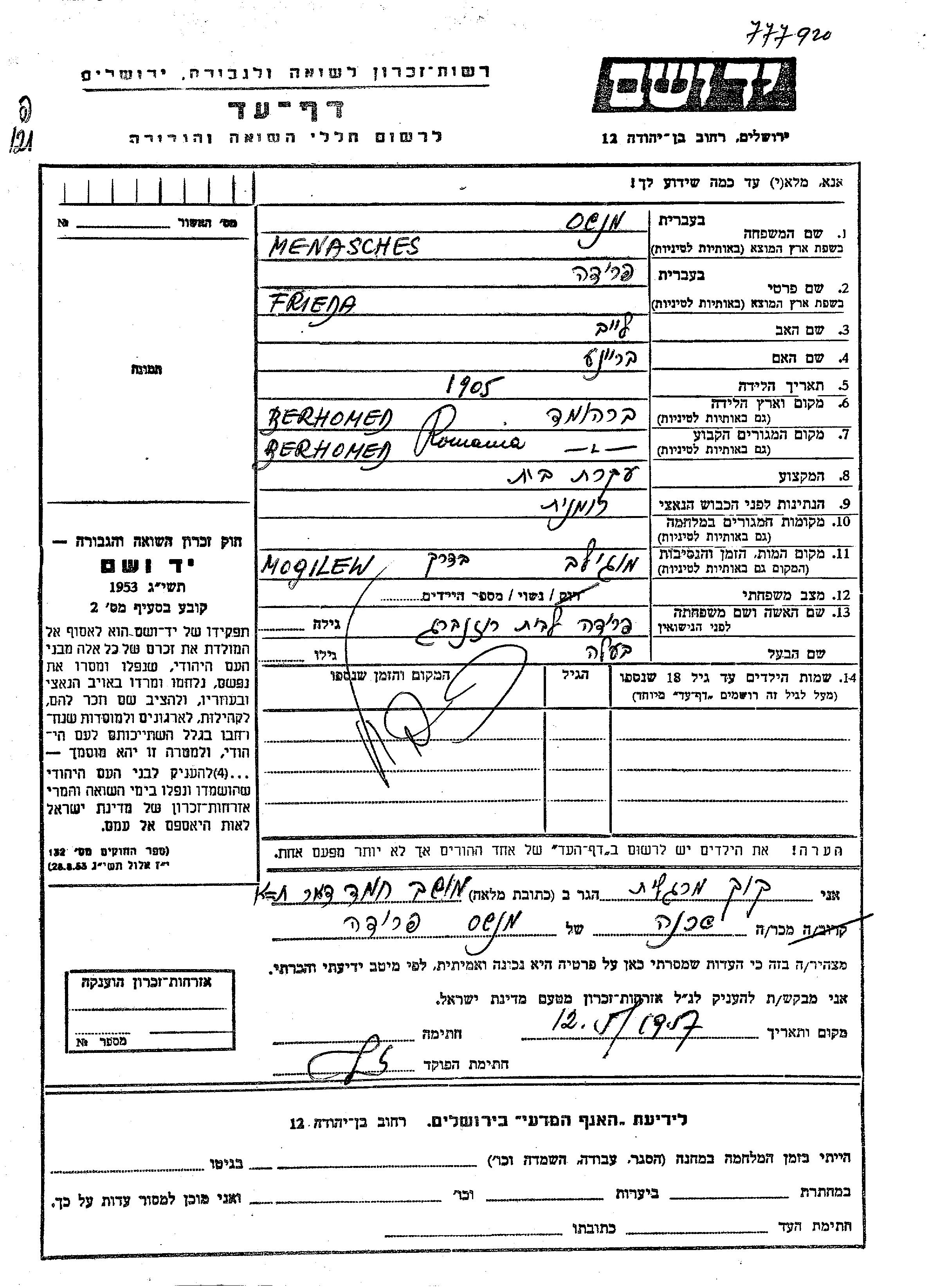 Menasches Frieda 1905 Berhomed, Roumanie Feuille de témoignage