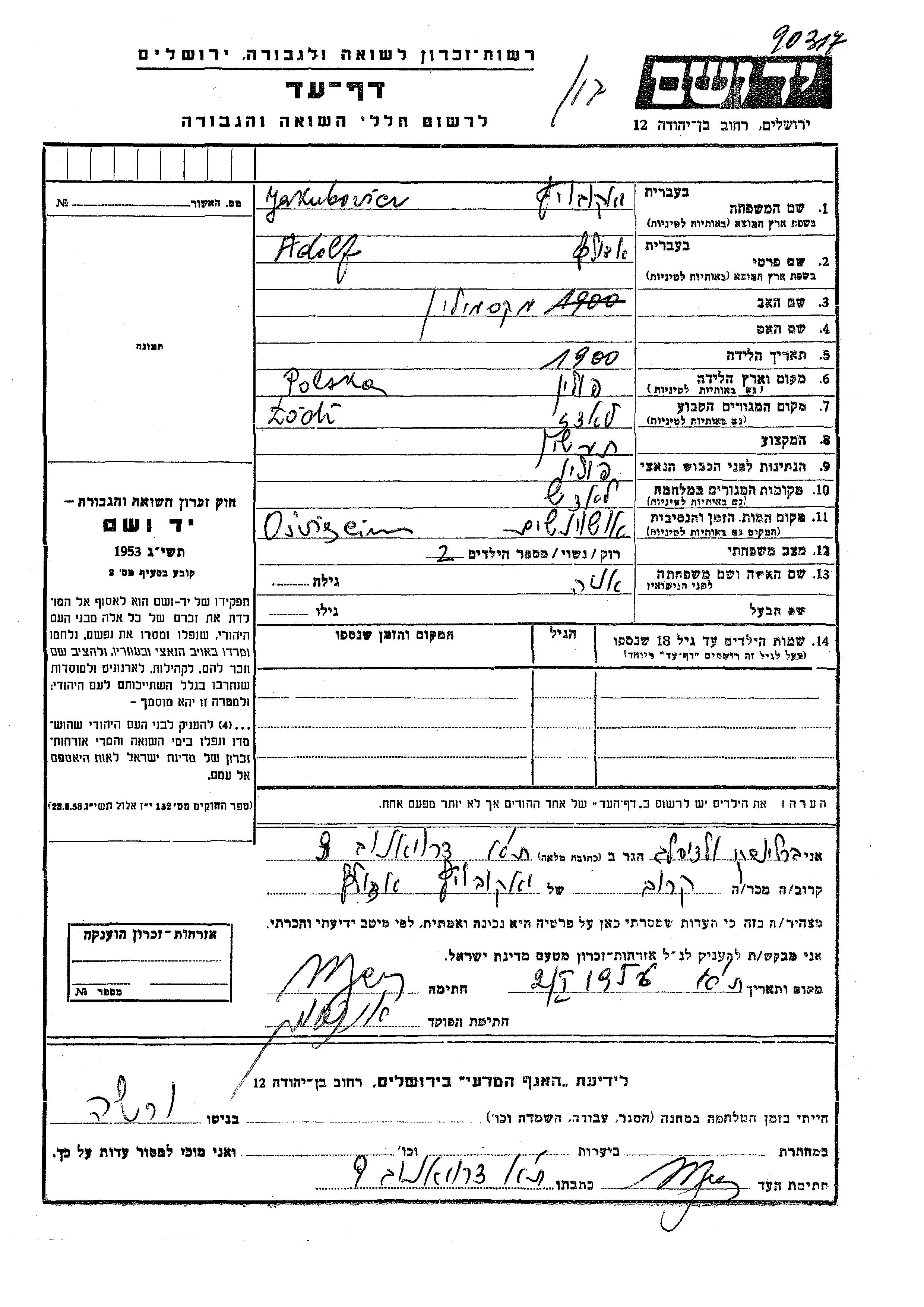 Yakubovicz Adolf 1900 Lodz, Pologne Feuille de témoignage
