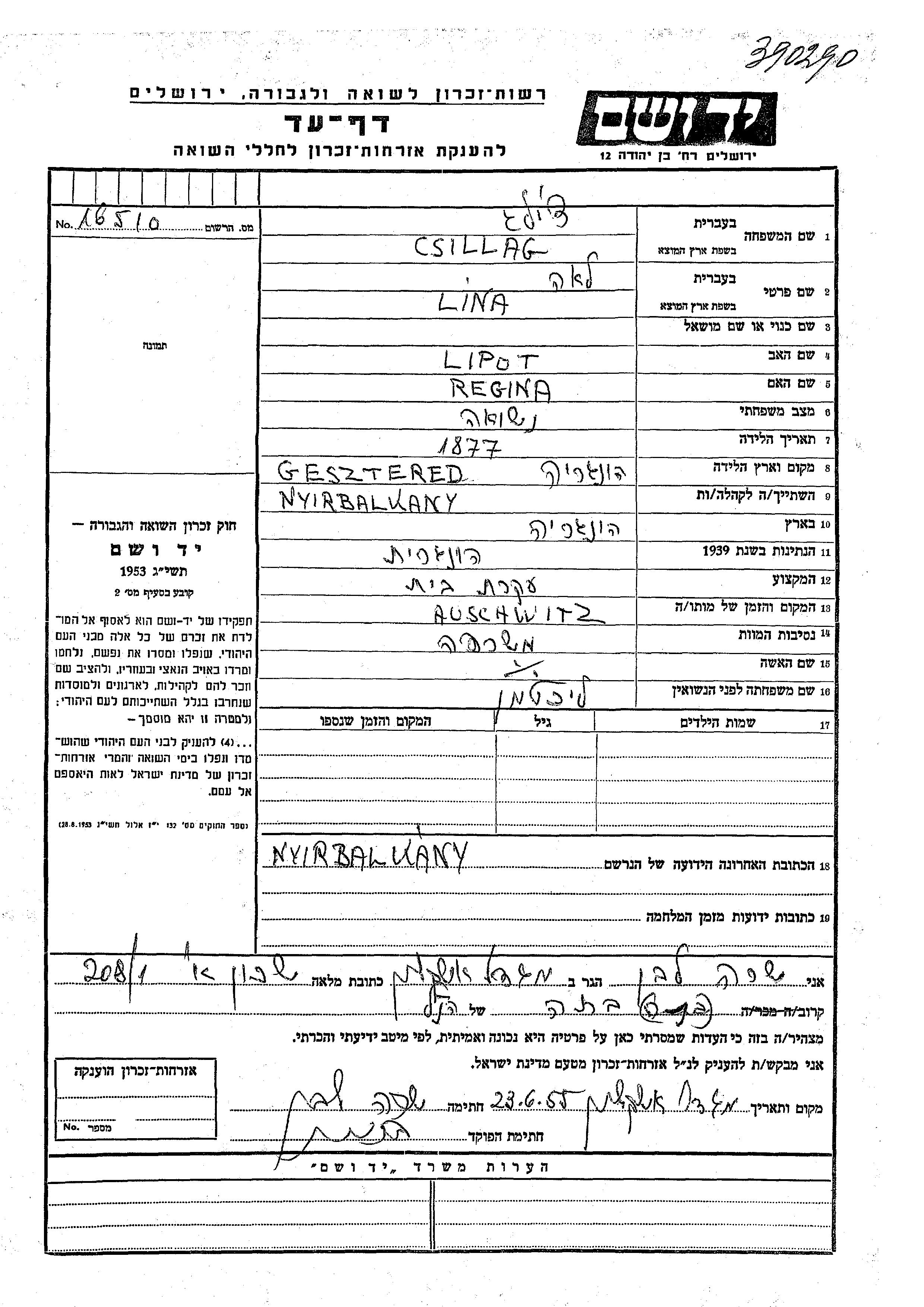 Csillag Lina Lea 1877 Nyirbalkany, Hongrie Feuille de témoignage