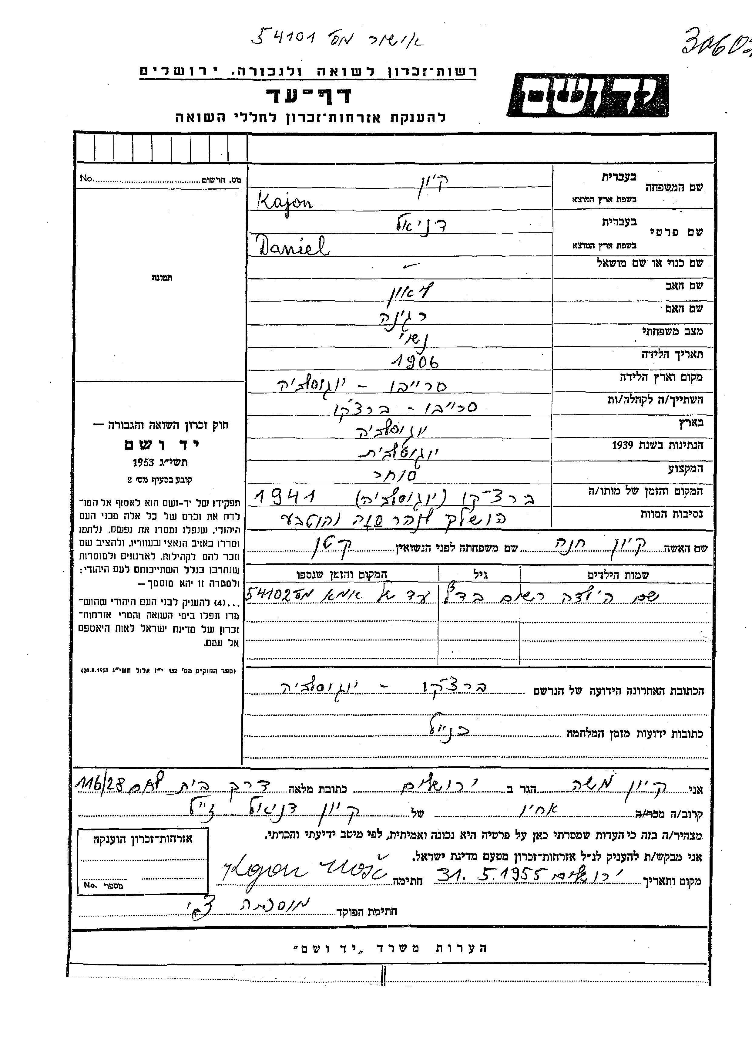 Kajon Daniel 1906 Brcko, Yugoslavie Feuille de témoignage