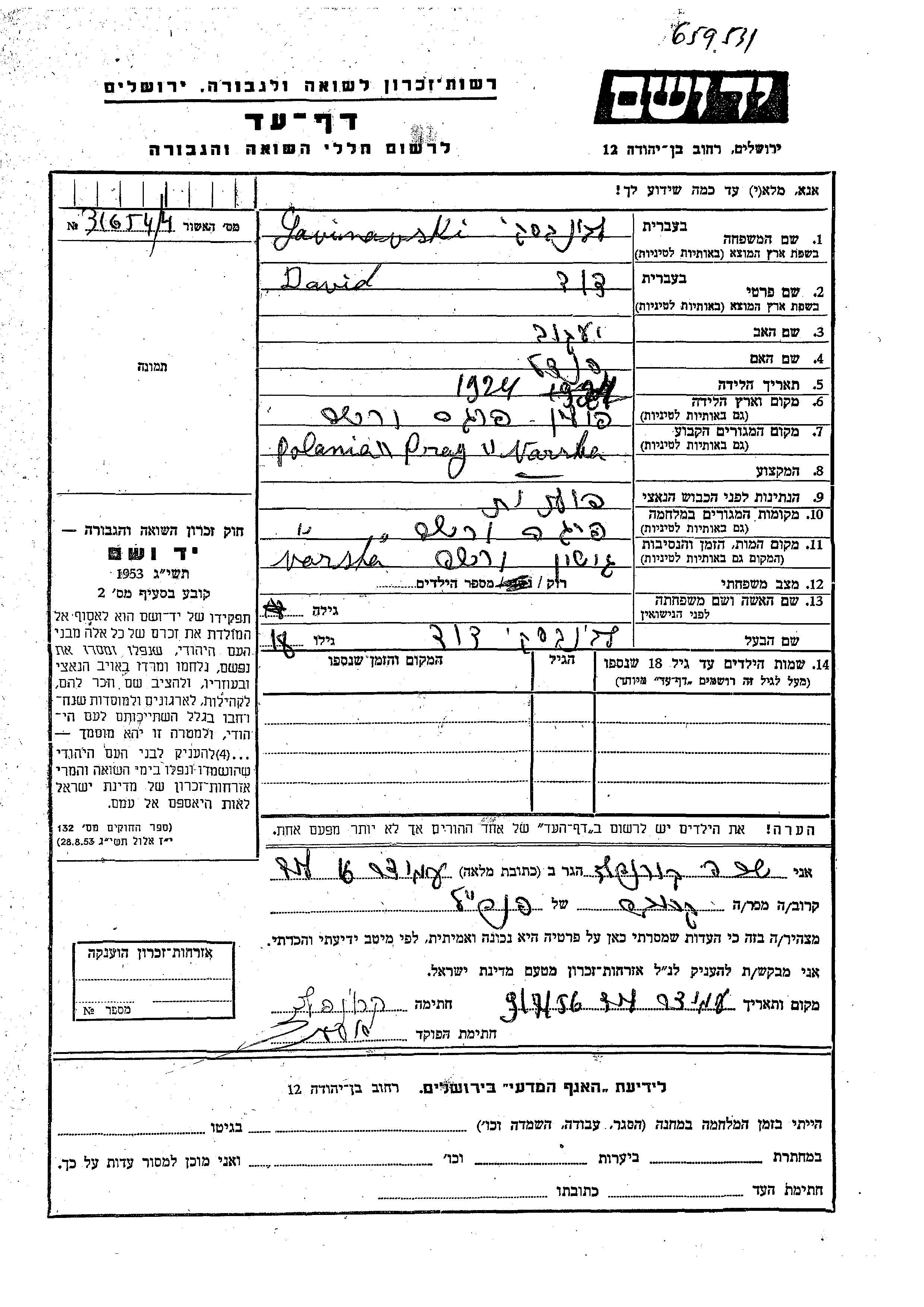 Levinovski David 1924 Warsaw, Pologne Feuille de témoignage