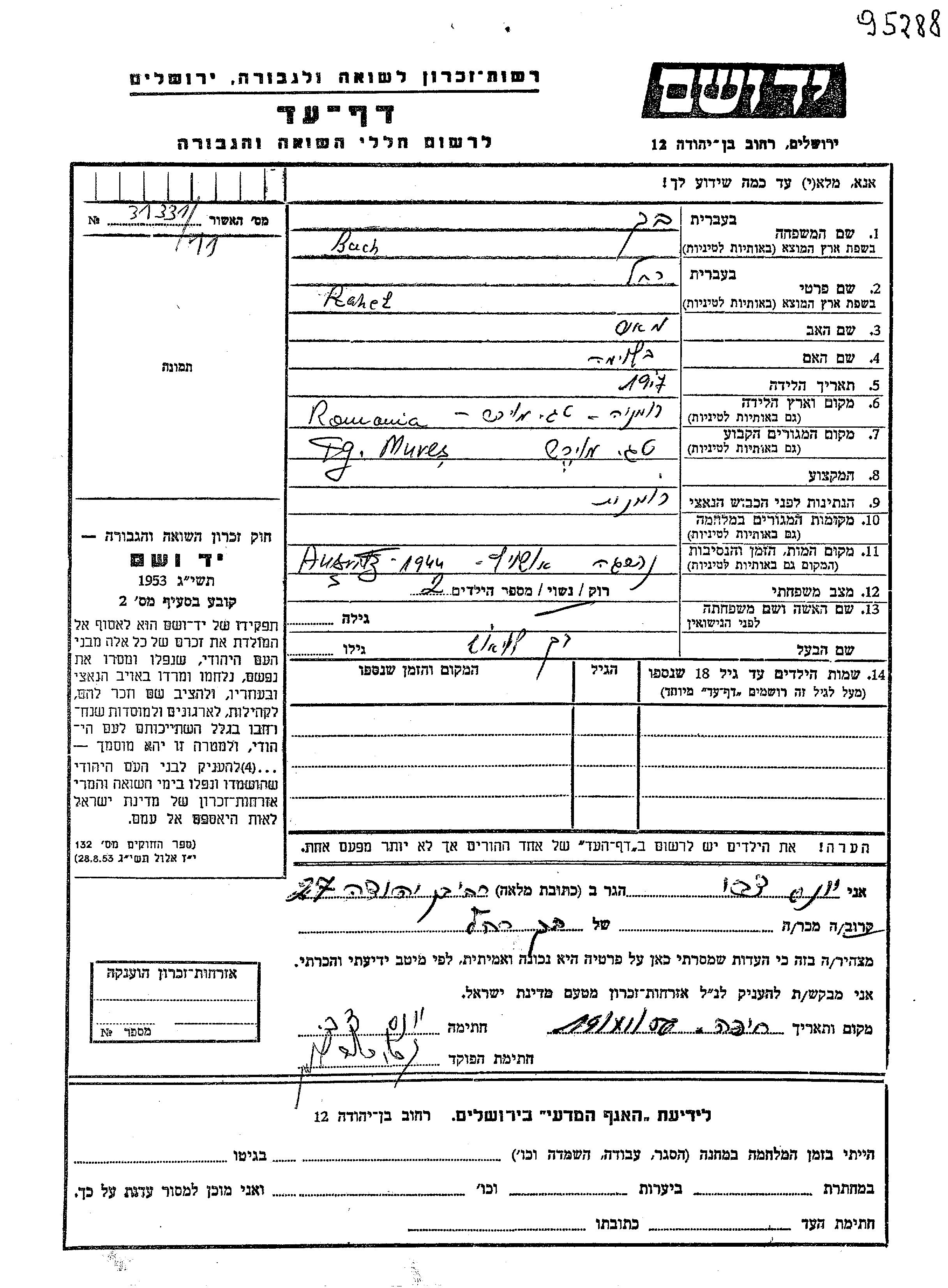 Rahel Bach est née à Tg Mures, Roumanie en 1917, fille de Meir et de Bluma. Elle était Mariée à Luiush. Avant la seconde guerre mondiale elle vivait à Tg Mures, Roumanie.
