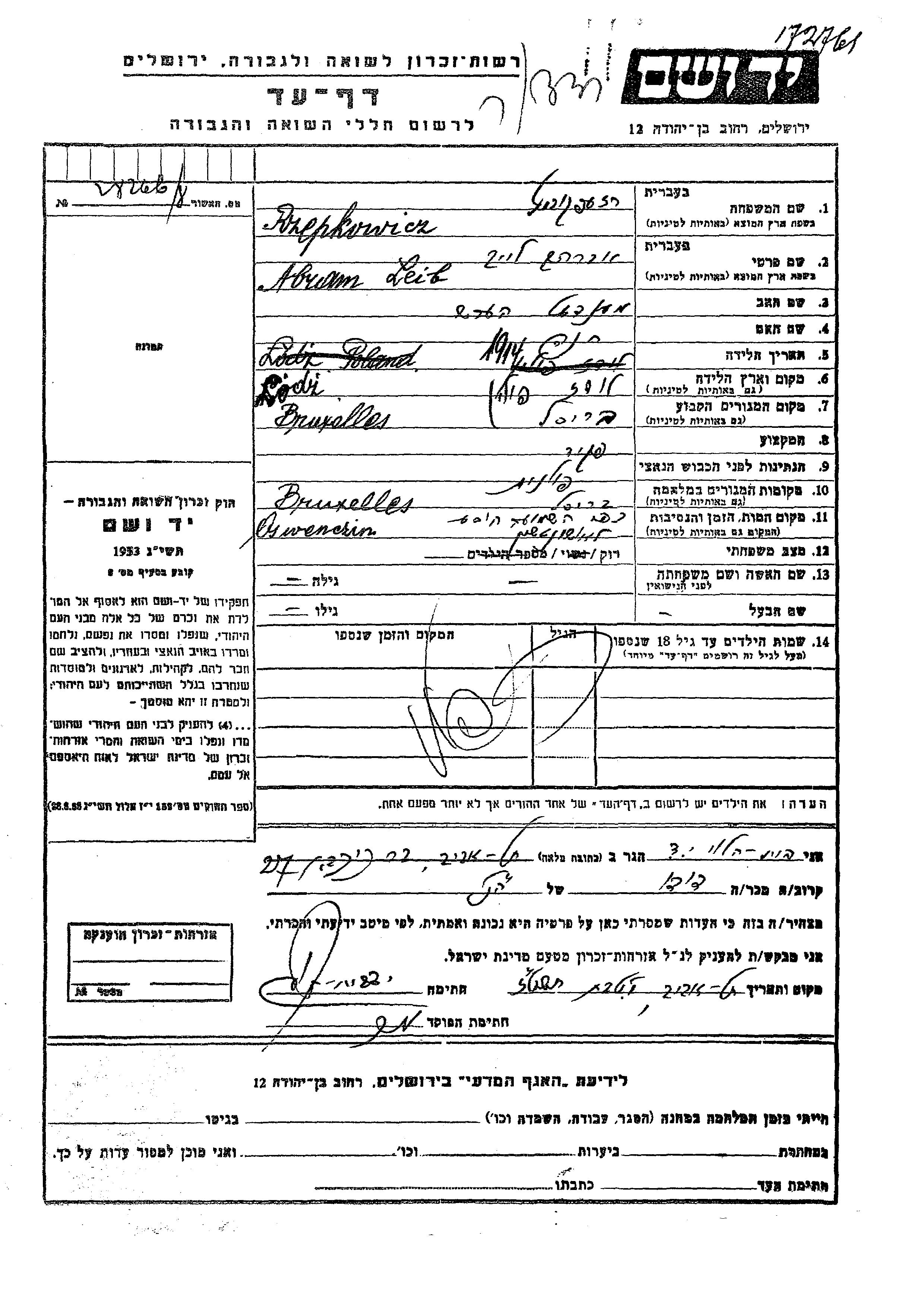 Rzepkowicz Abram Leib 1914 Bruxelles, Belgique Feuille de témoignage