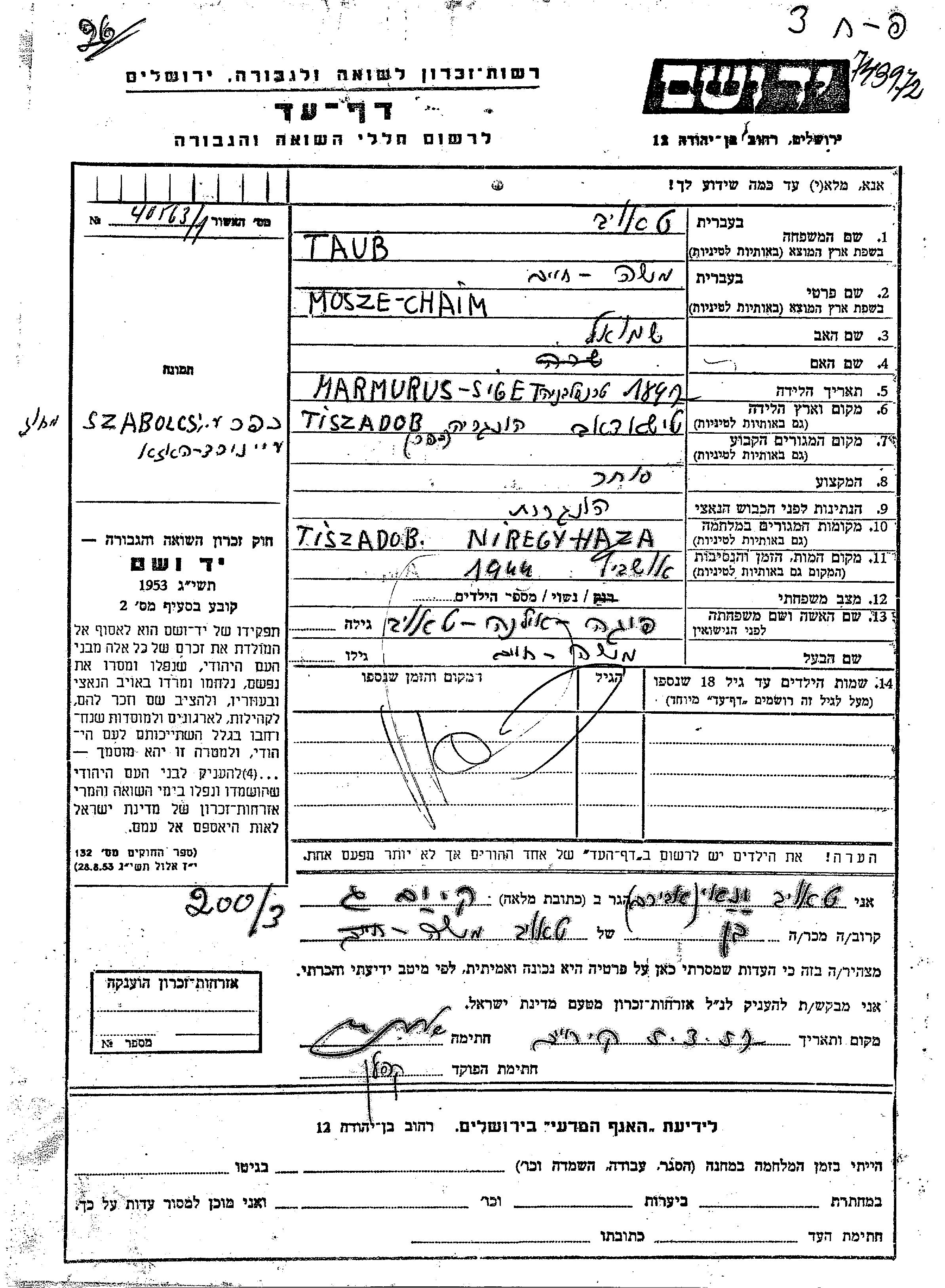 Taub Mosze Chaim 1897 endroit inconnu, Feuille de témoignage