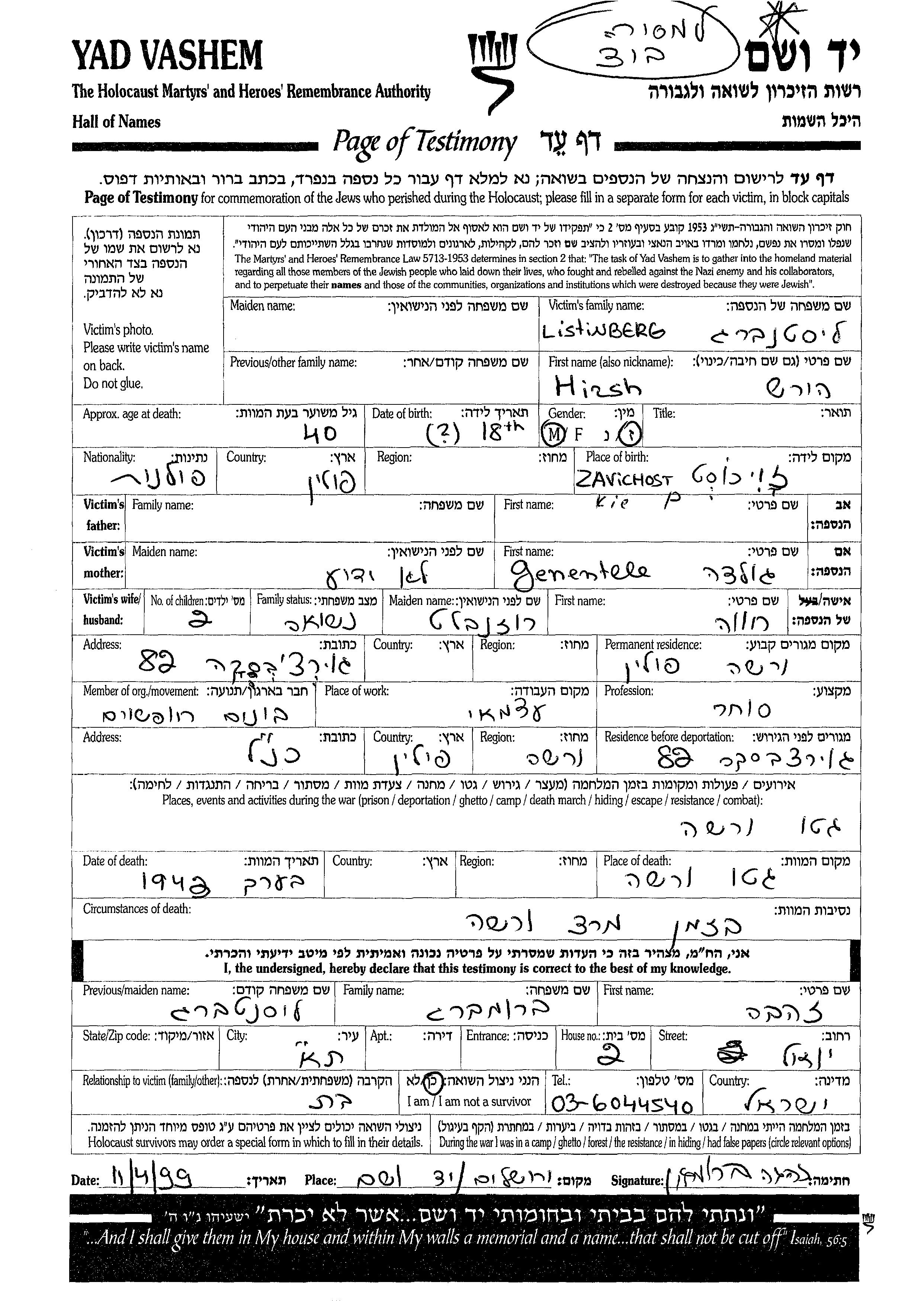 Listinberg Hirsh Warsaw, Pologne Feuille de témoignage