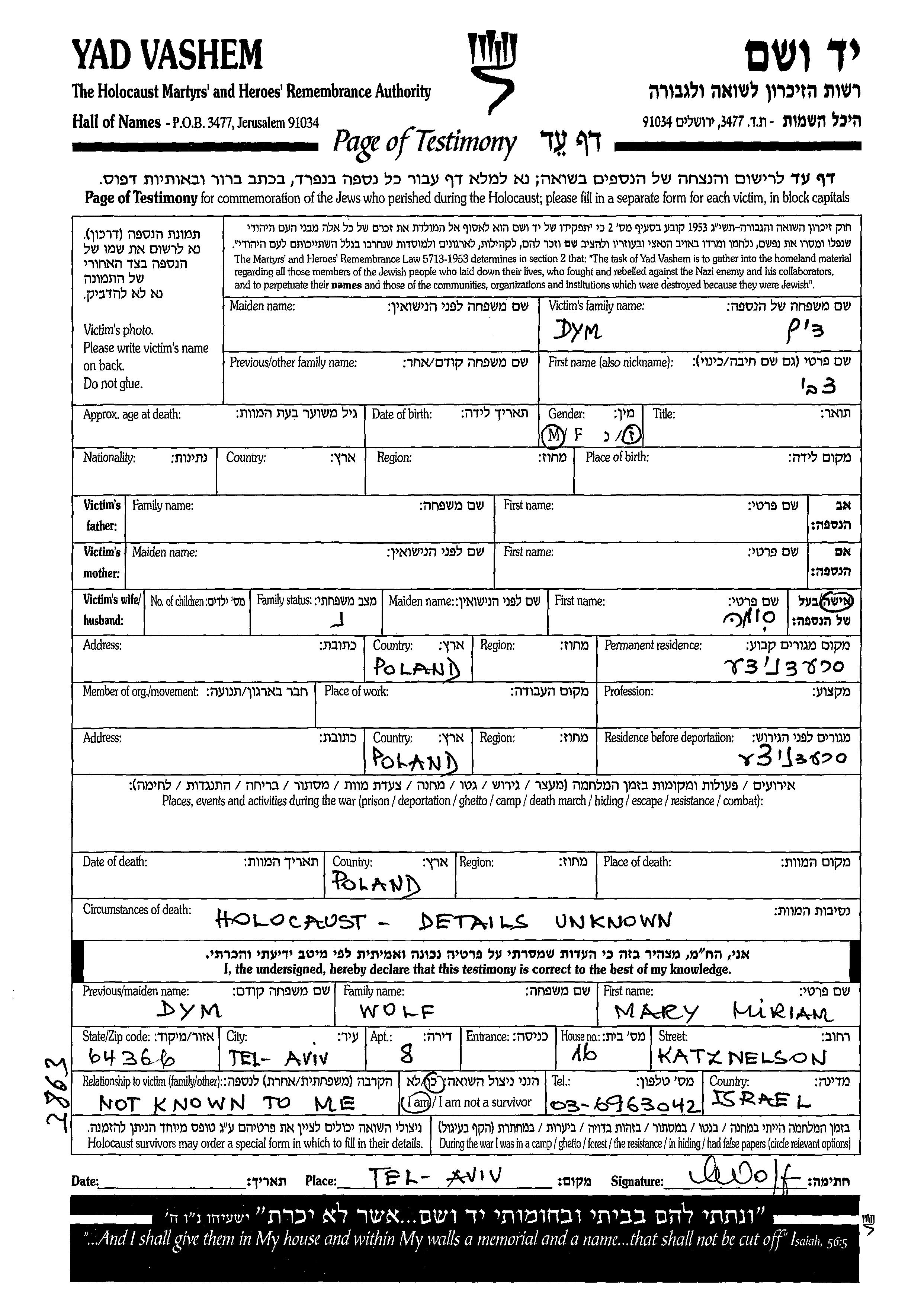 Tzvi Dym. Il était Mariée à Sima. Avant la seconde guerre mondiale il vivait à Serednica, Pologne. Au cours de la guerre, il était à Serednica, Pologne.