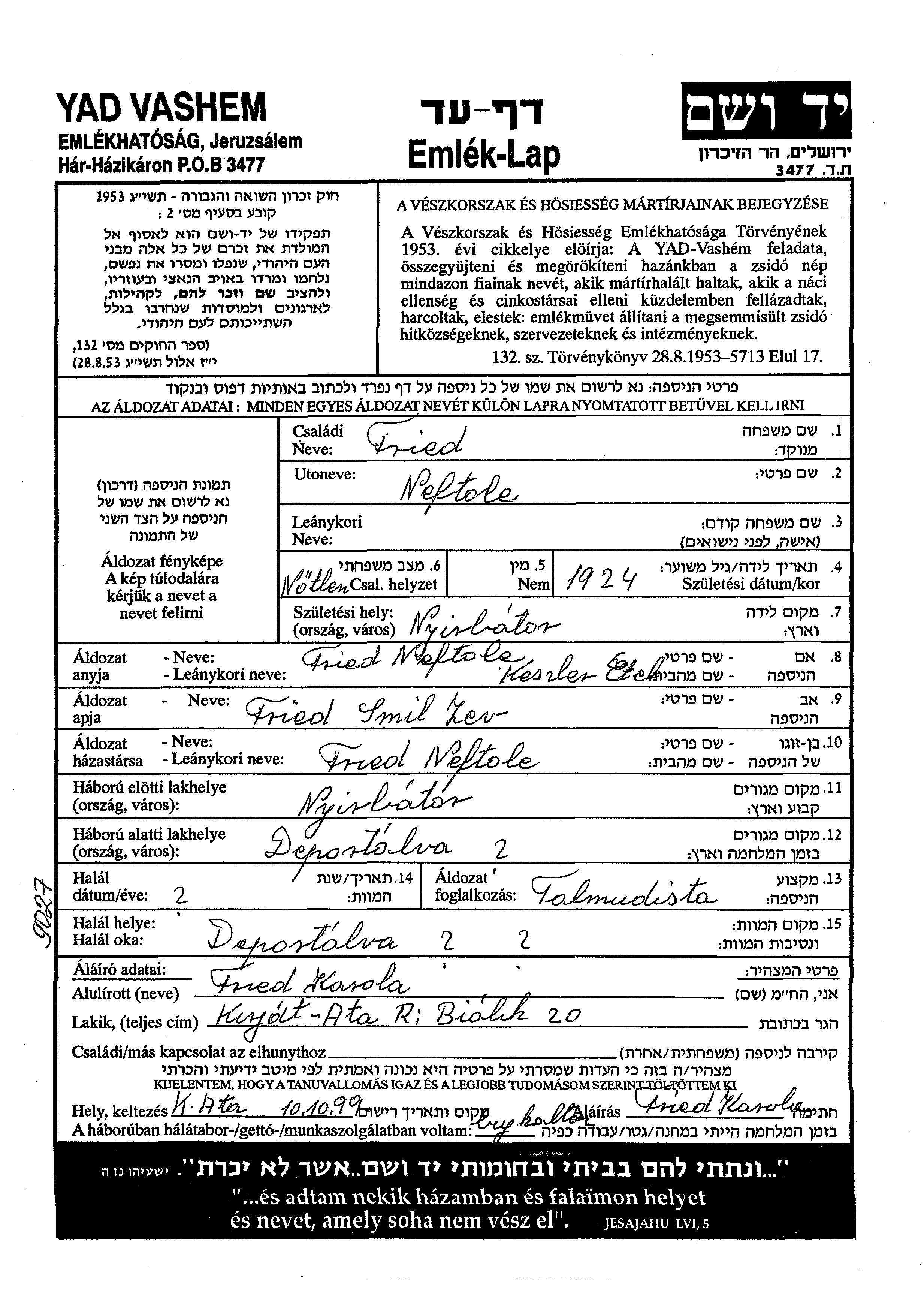 Fried Neftole 1924 Nyirbator, Hongrie Feuille de témoignage