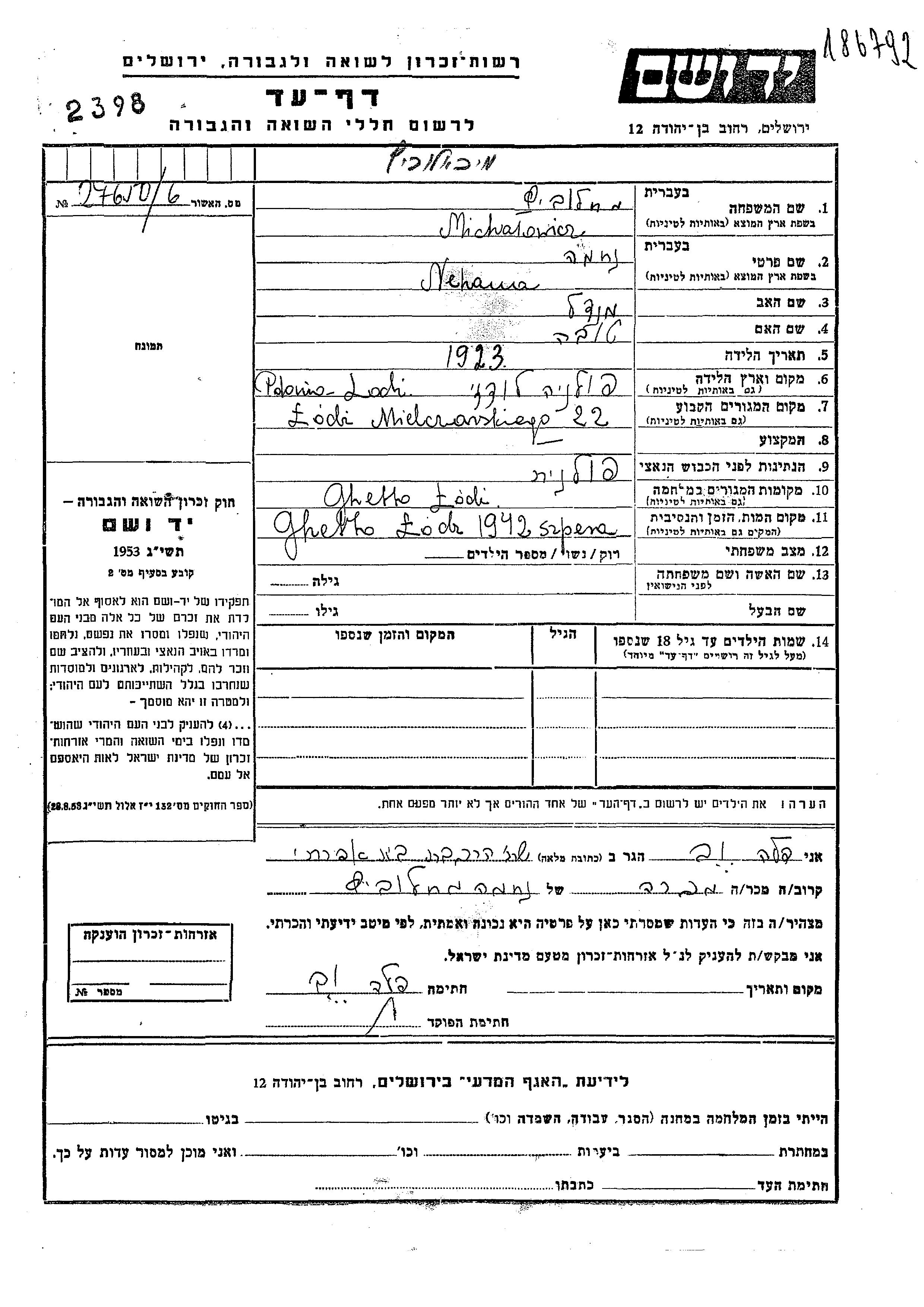 Michalowicz Nehama 1923 Lodz, Pologne Feuille de témoignage