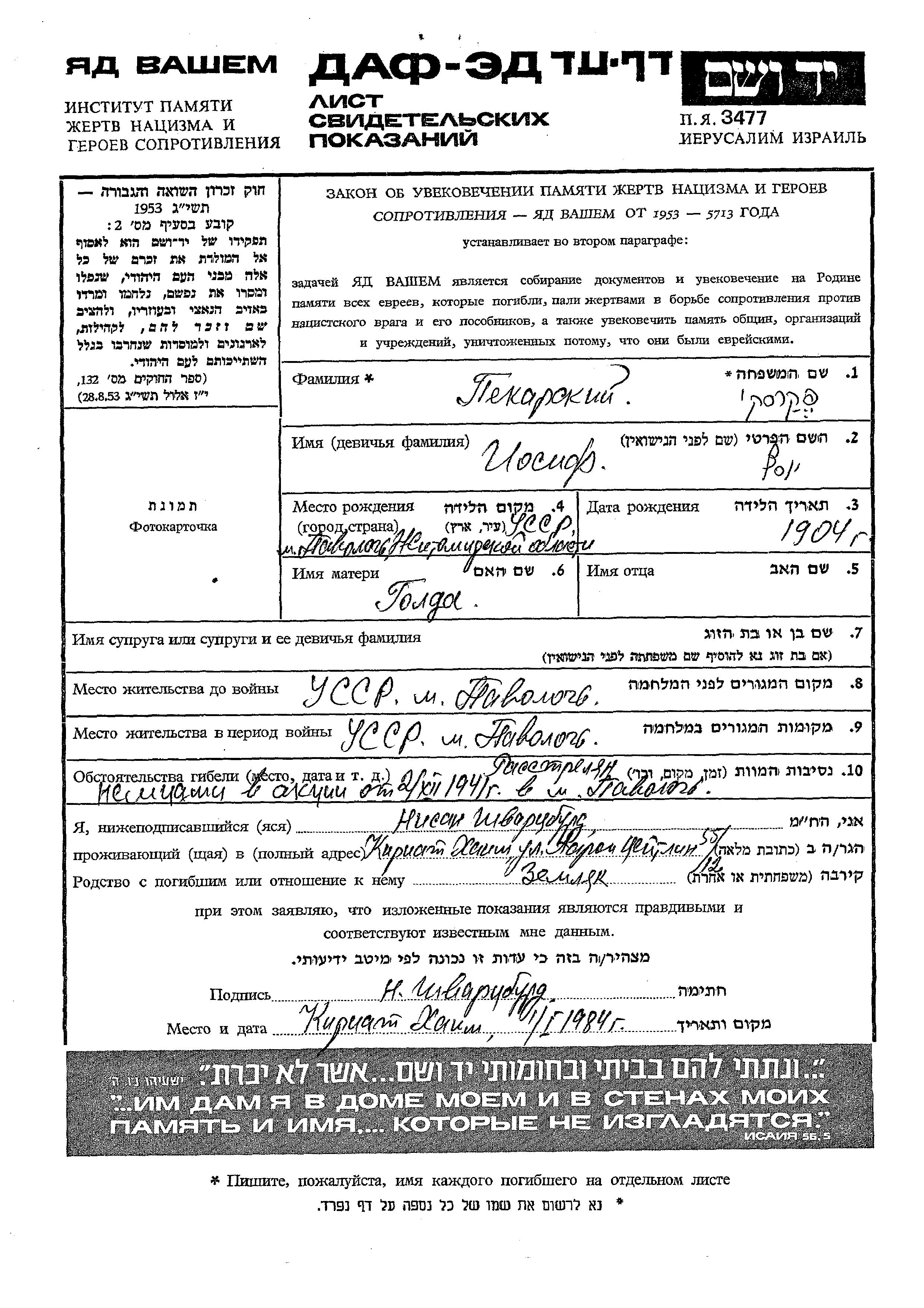 Pekarski Iosif 1904 Pavoloch, Ukraine (URSS) Feuille de témoignage