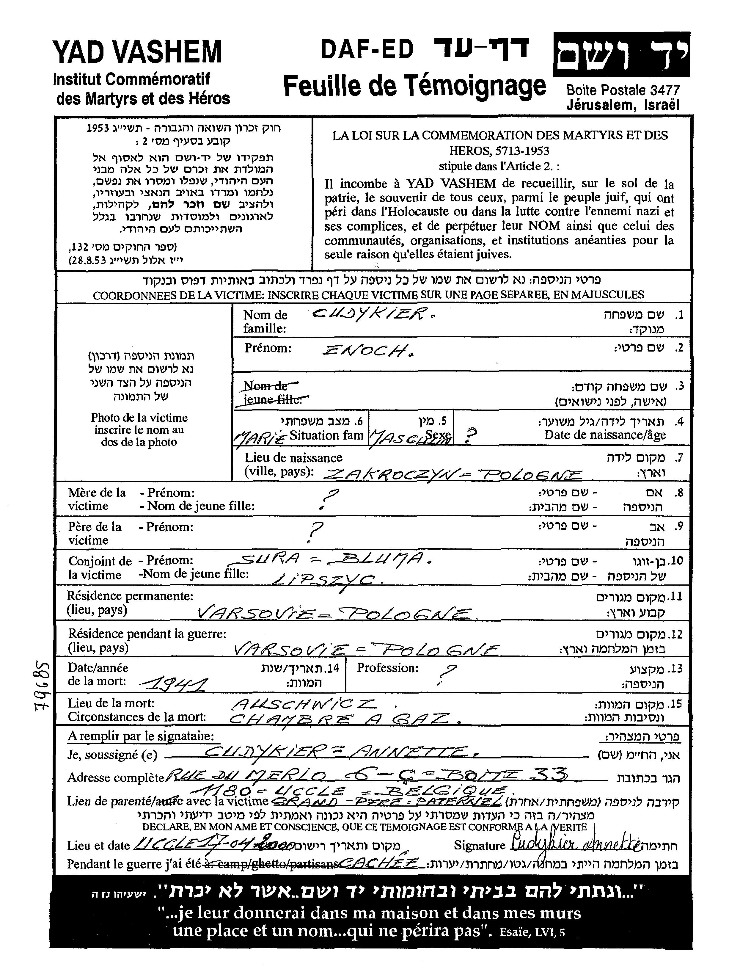 Cudykier Enoch Warsaw, Pologne Feuille de témoignage