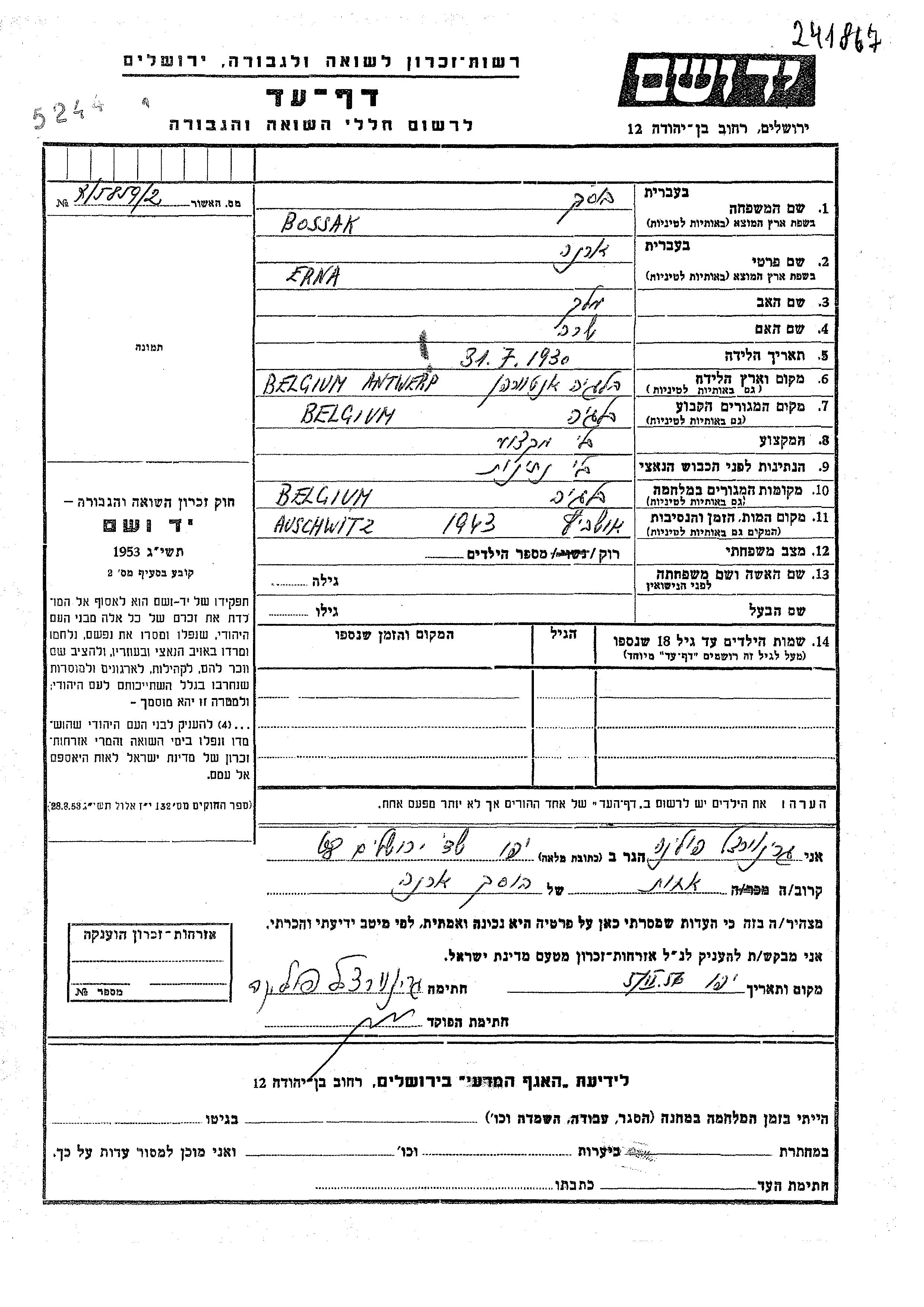 Erna Bossak est née à Antwerpen, Belgique en 1930, fille de Melekh et de Sara. Elle était Célibataire. Avant la seconde guerre mondiale elle vivait à Belgique. Pendant la guerre, elle était à Belgique.