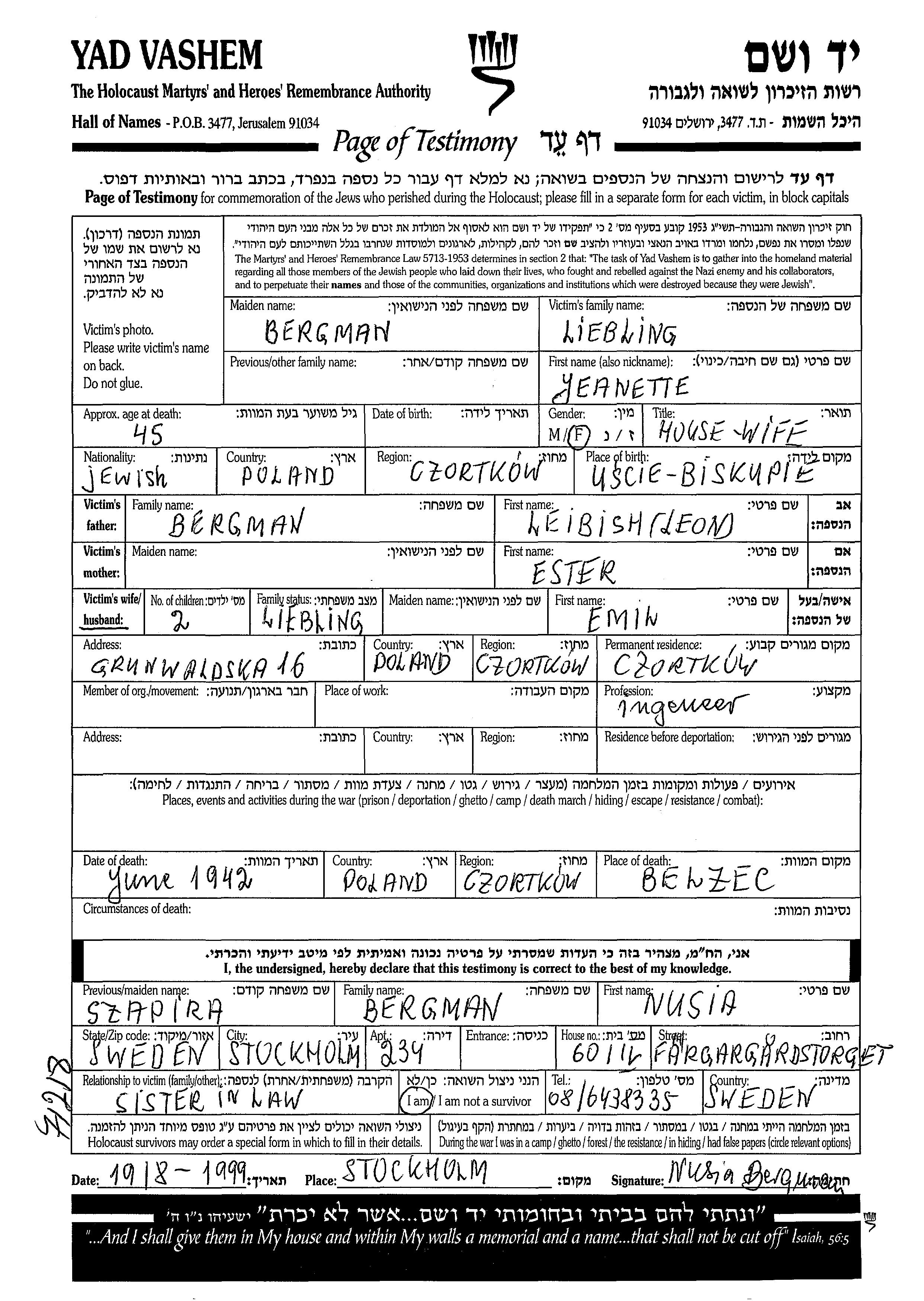 Yad Vashem - Pages of Testimony Names Memorial Collection