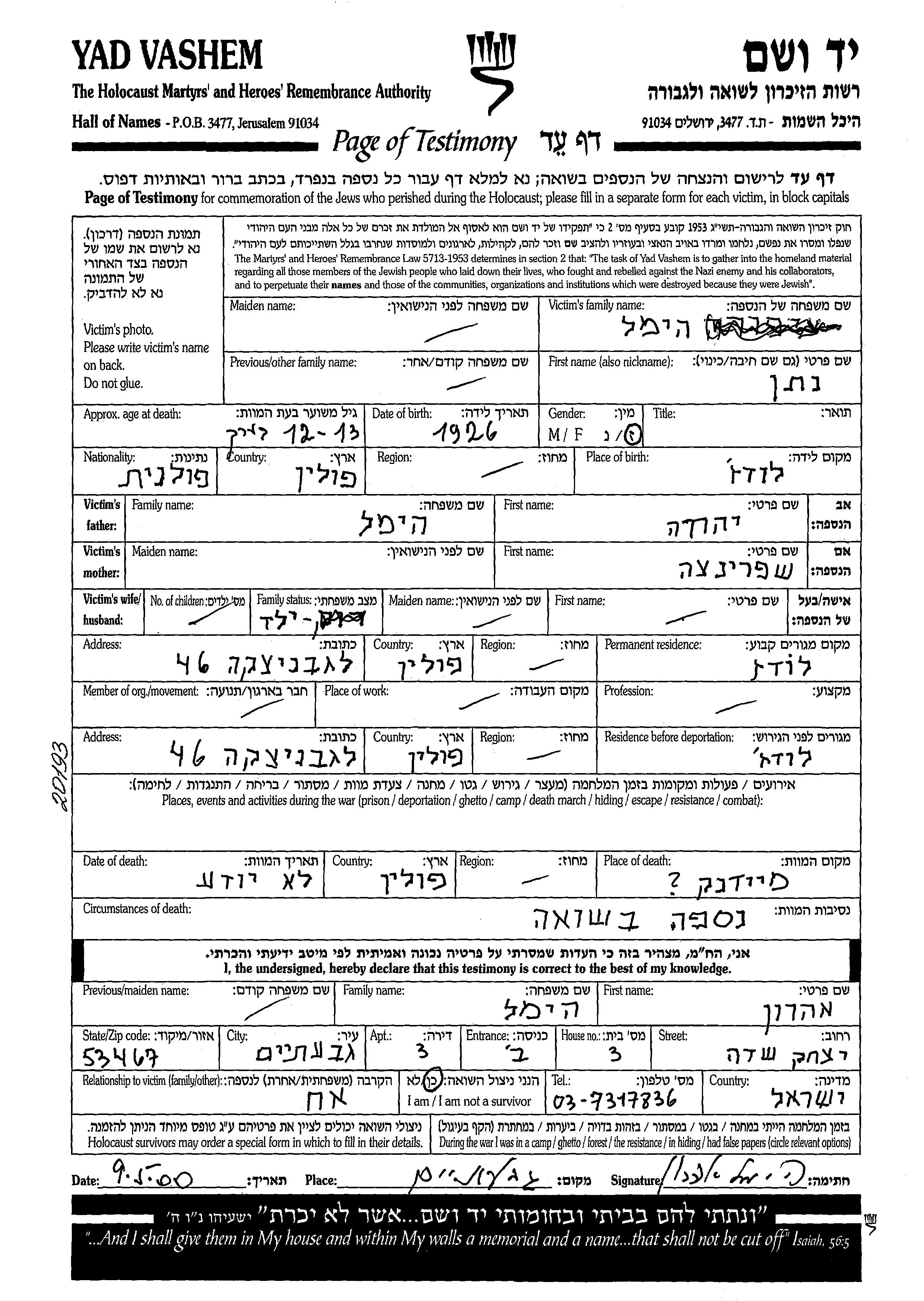 Himel Natan 1926 Lodz, Pologne Feuille de témoignage