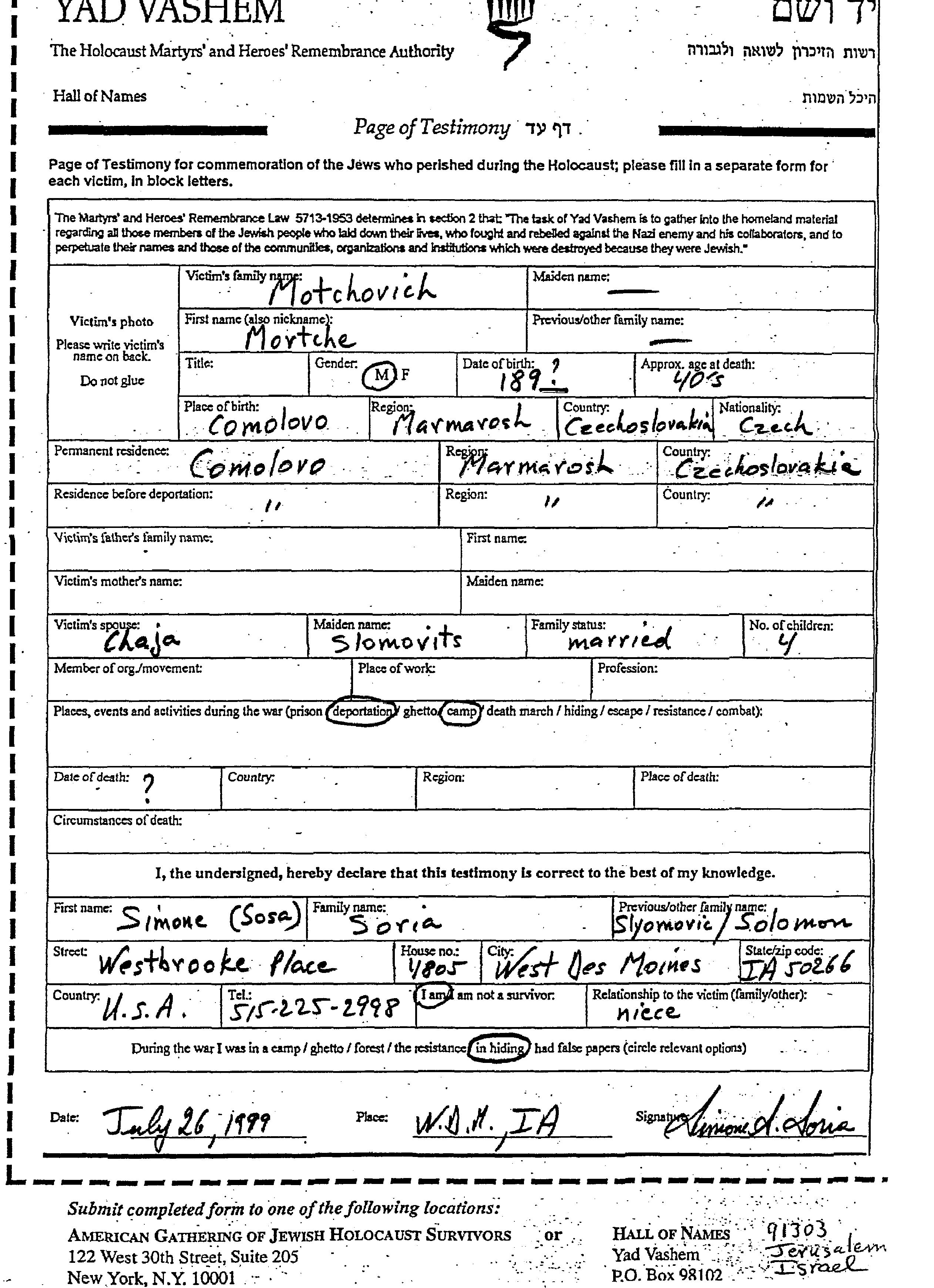 Motchovich Mortche Comalovo, Tchécoslovaquie Feuille de témoignage
