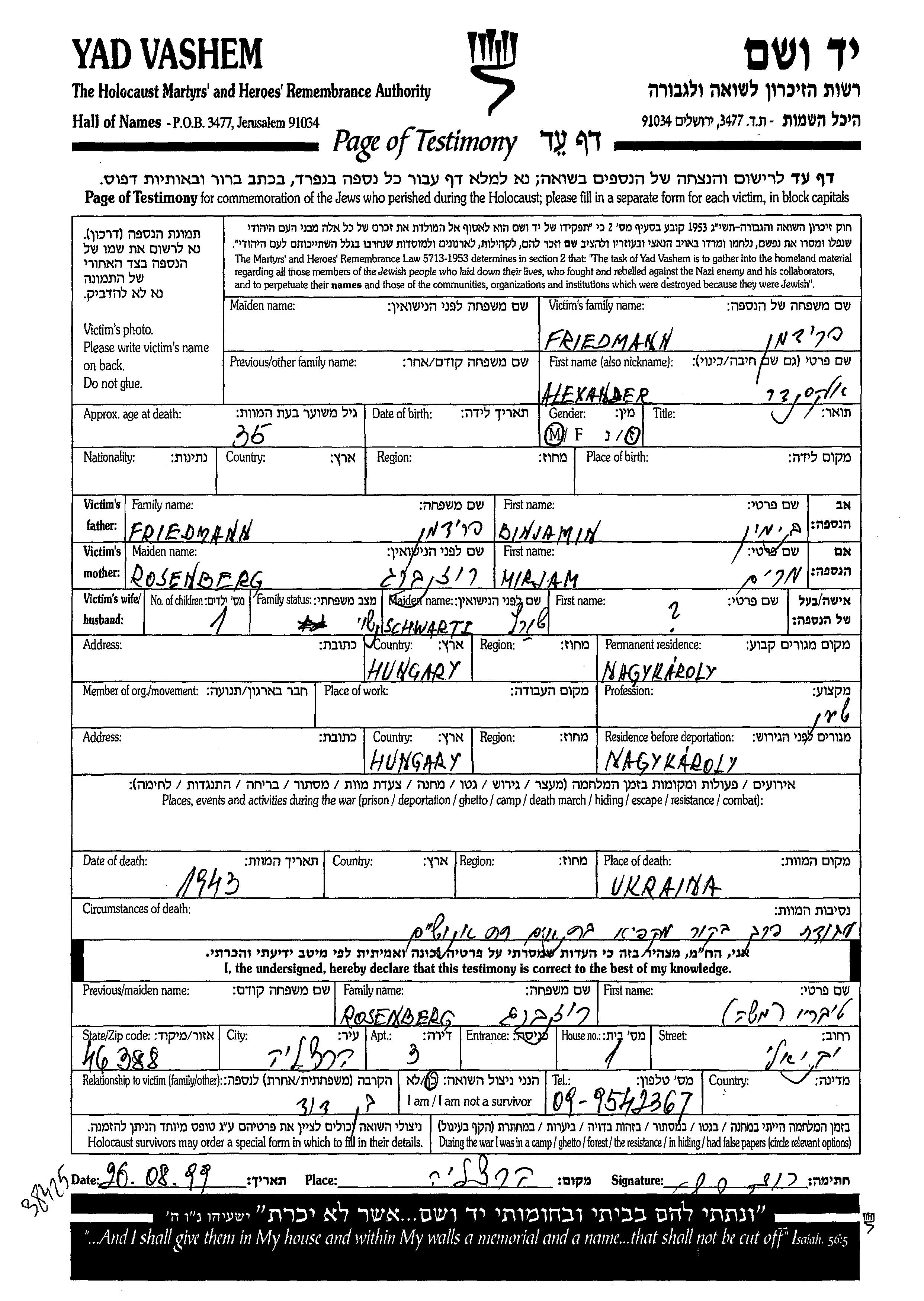 Friedmann Alexander Nagykaroly, Roumanie Feuille de témoignage