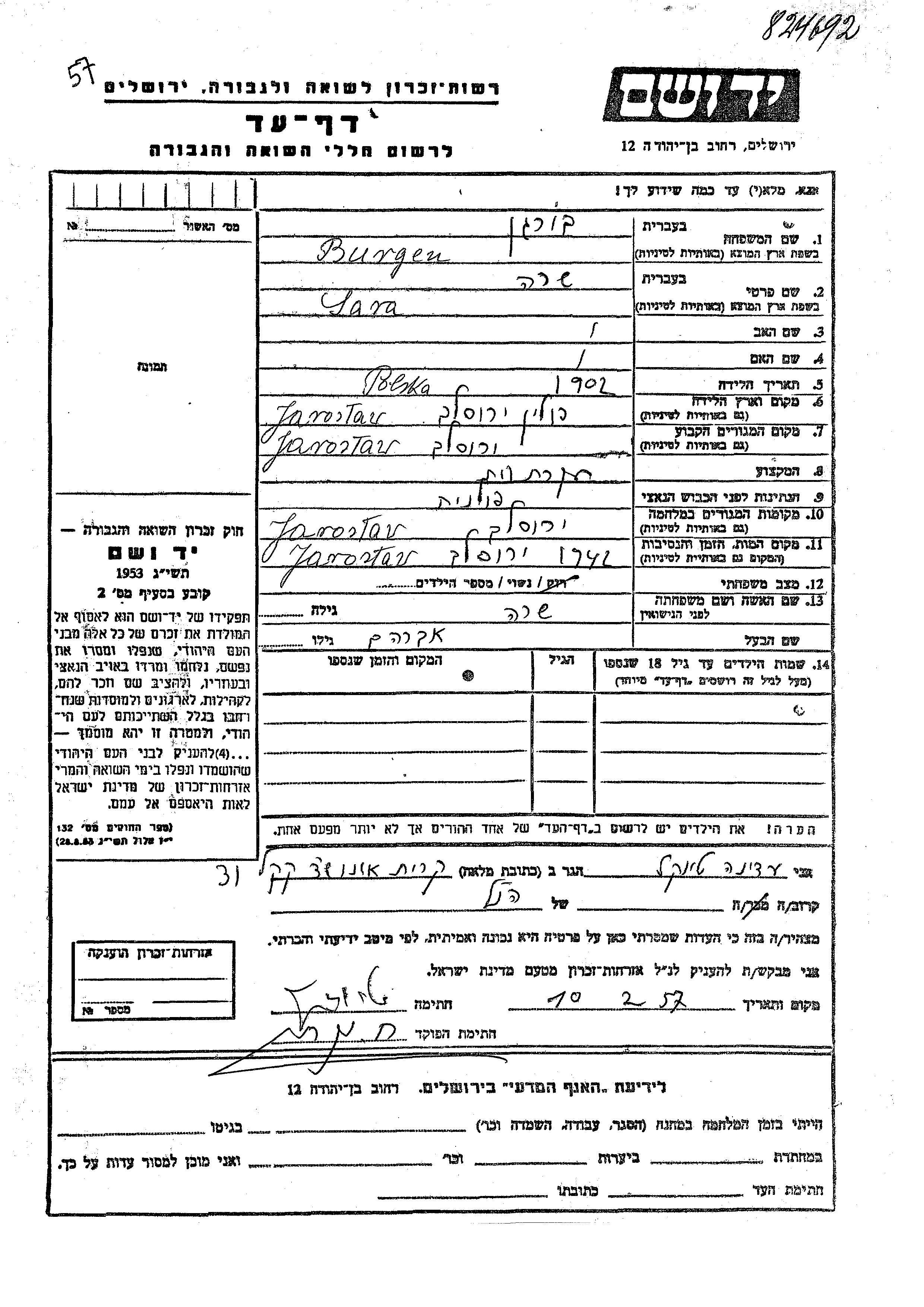 Sara Burgen est née à Yaroslav, Pologne en 1902. Elle était Femme au foyer et Mariée à Avraham. Avant la seconde guerre mondiale elle vivait à Yaroslav, Pologne. Pendant la guerre, elle était à Yaroslav, Pologne.