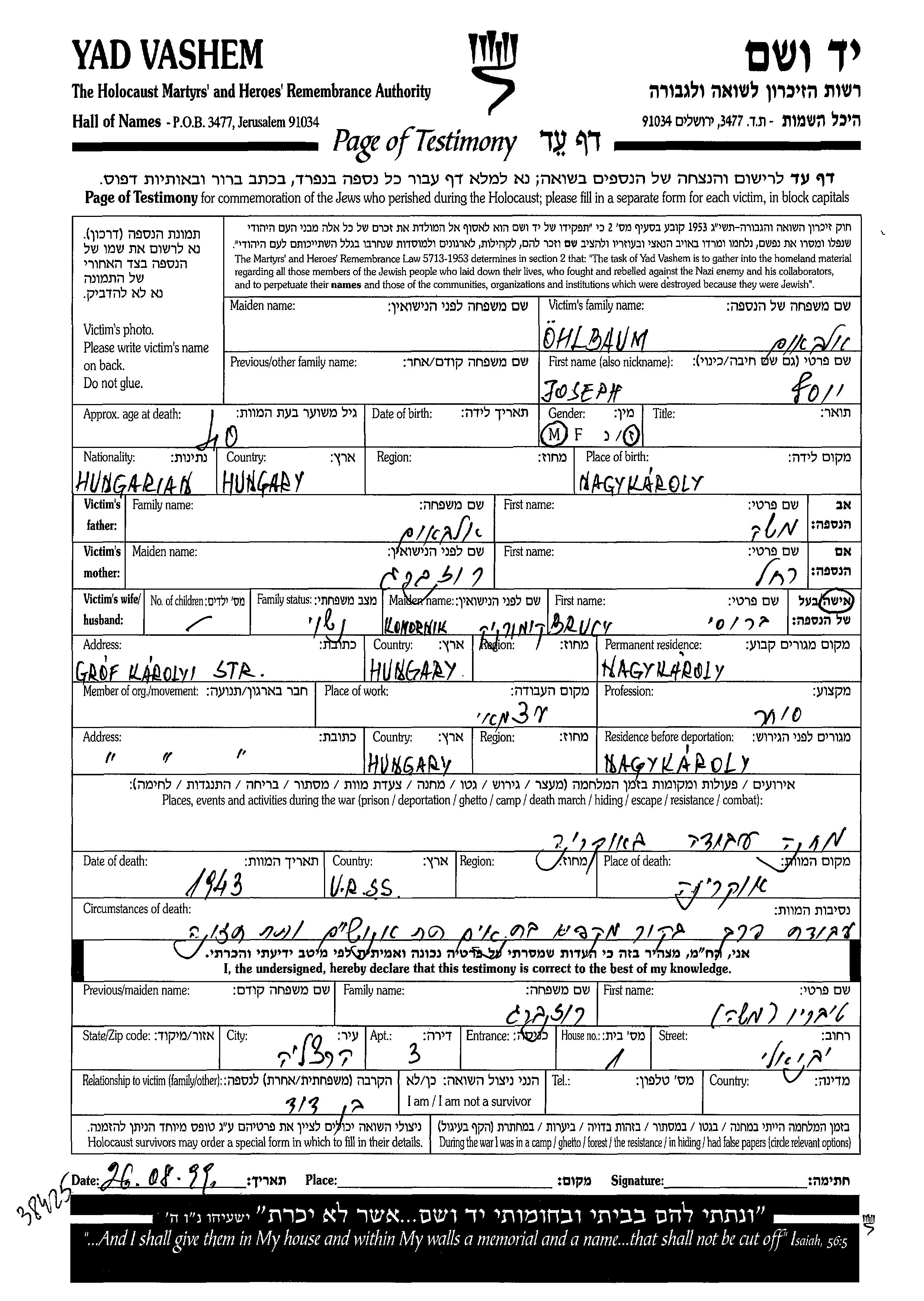 Ohlbaum Joseph Nagy Karoly, Roumanie Feuille de témoignage