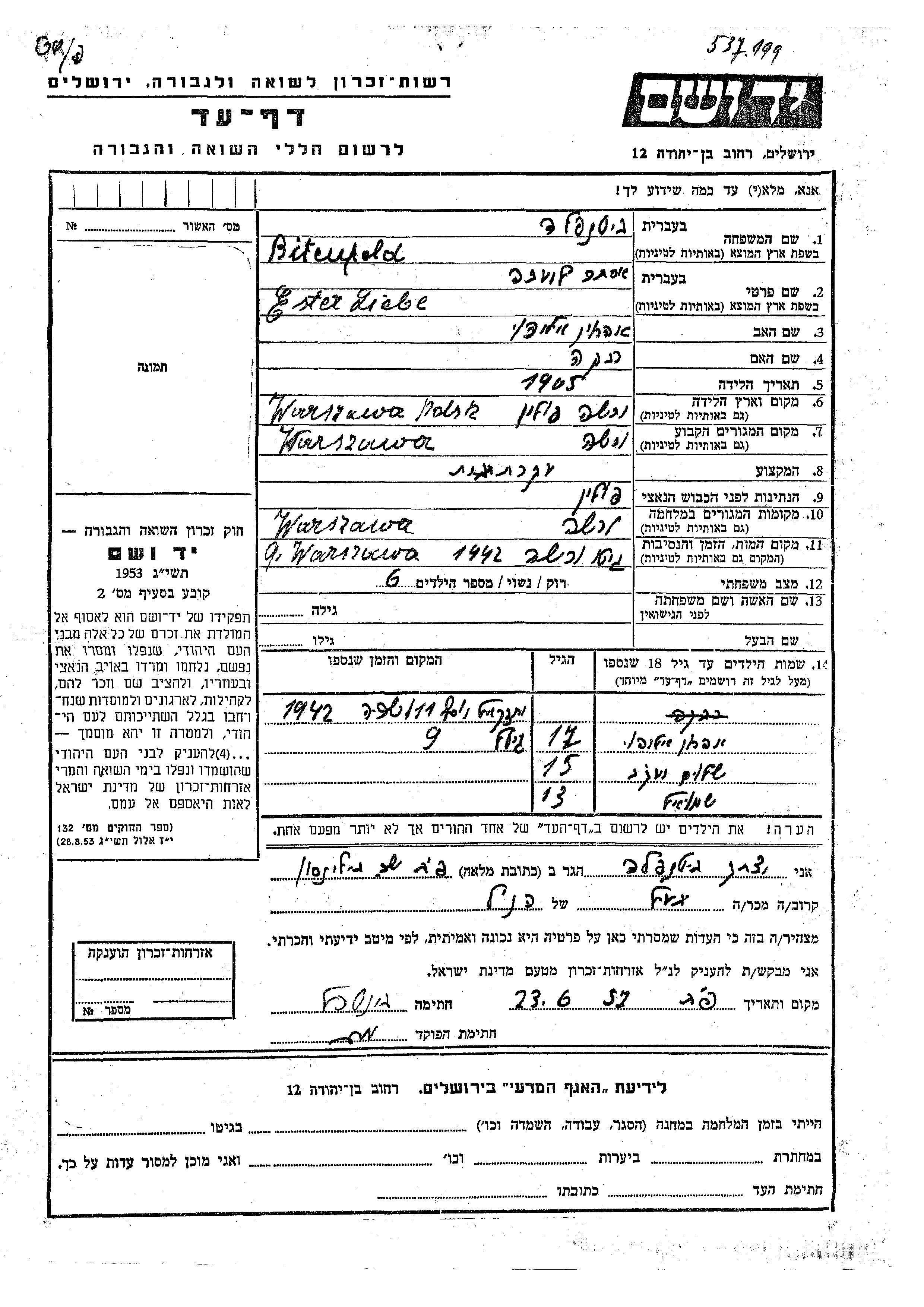 Liebe Ester Luba Bitenfeld est née à Warszawa, Pologne en 1905, fille de Aharon Eliahu et de Rivka. Elle était Femme au foyer et Mariée. Avant la seconde guerre mondiale elle vivait à Warszawa, Pologne. Pendant la guerre, elle était à Warszawa, Pologne.