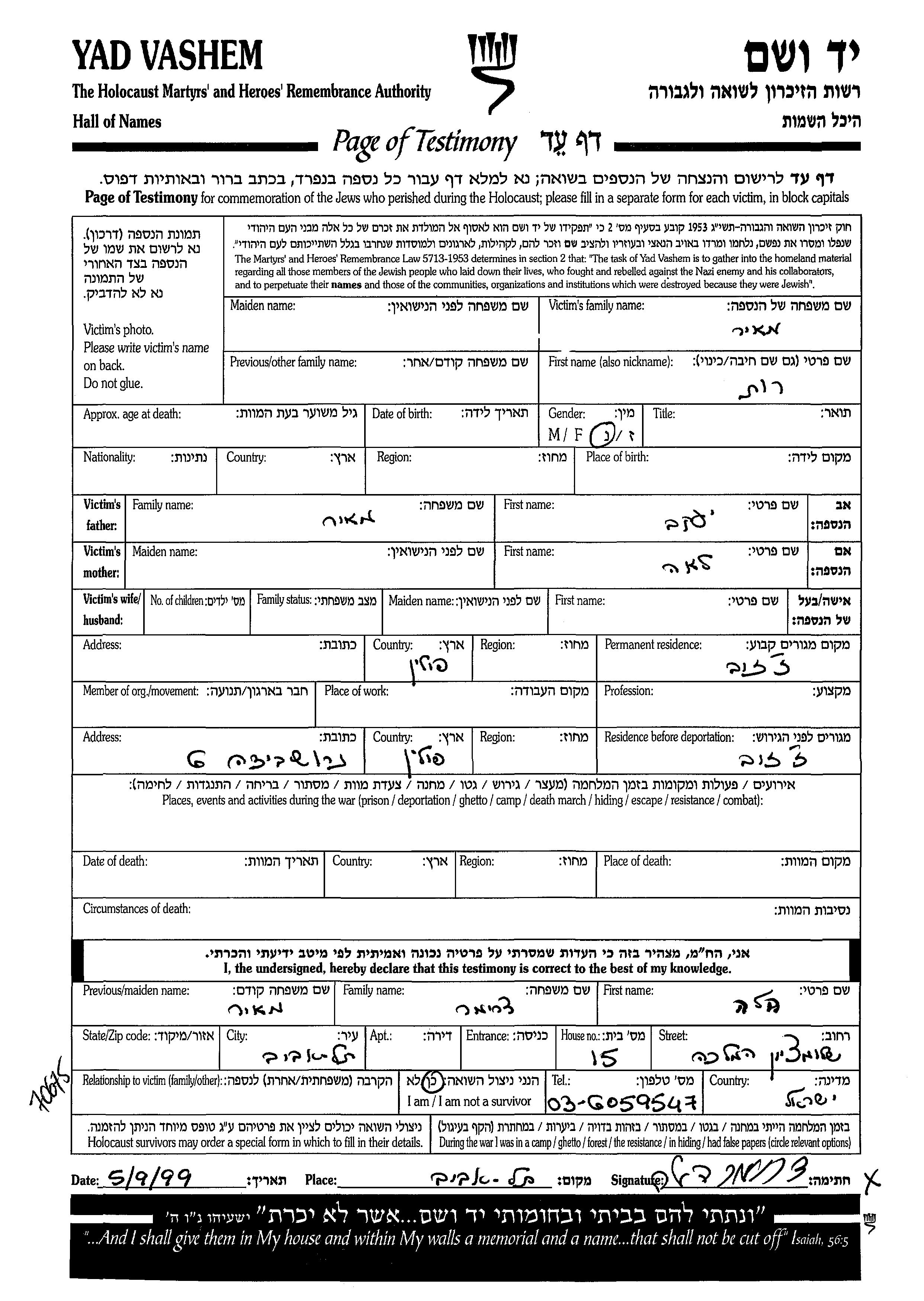 Yad Vashem - Pages of Testimony Names Memorial Collection