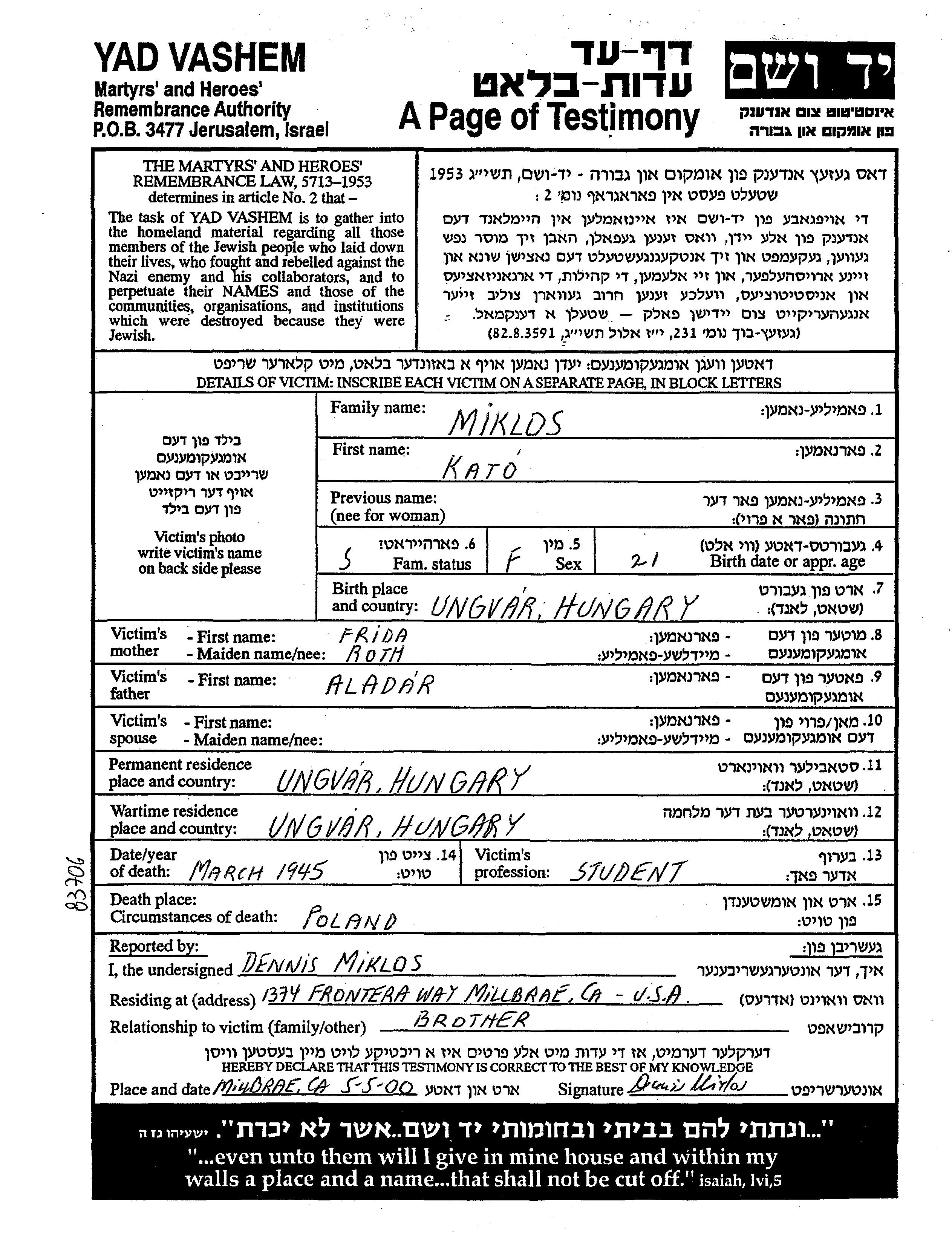 Kato Miklos est née à Ungvar, Tchécoslovaquie, fille de Aladar et de Frida. Elle était Étudiant/e et Célibataire. Avant la seconde guerre mondiale elle vivait à Ungvar, Tchécoslovaquie. Pendant la guerre, elle était à Ungvar, Tchécoslovaquie.