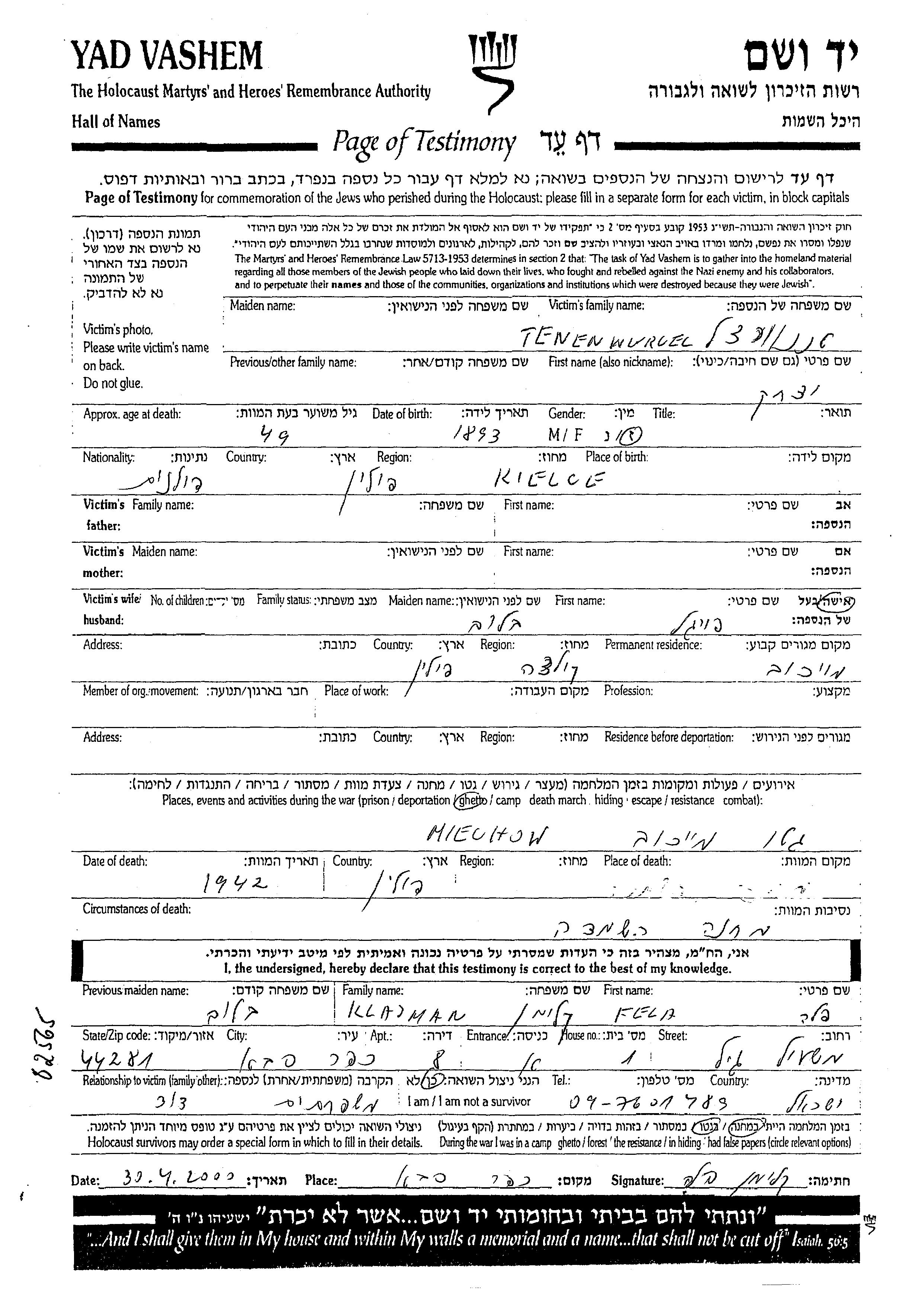Tenenwurcel Yitzkhak 1893 Miechów, Pologne Feuille de témoignage