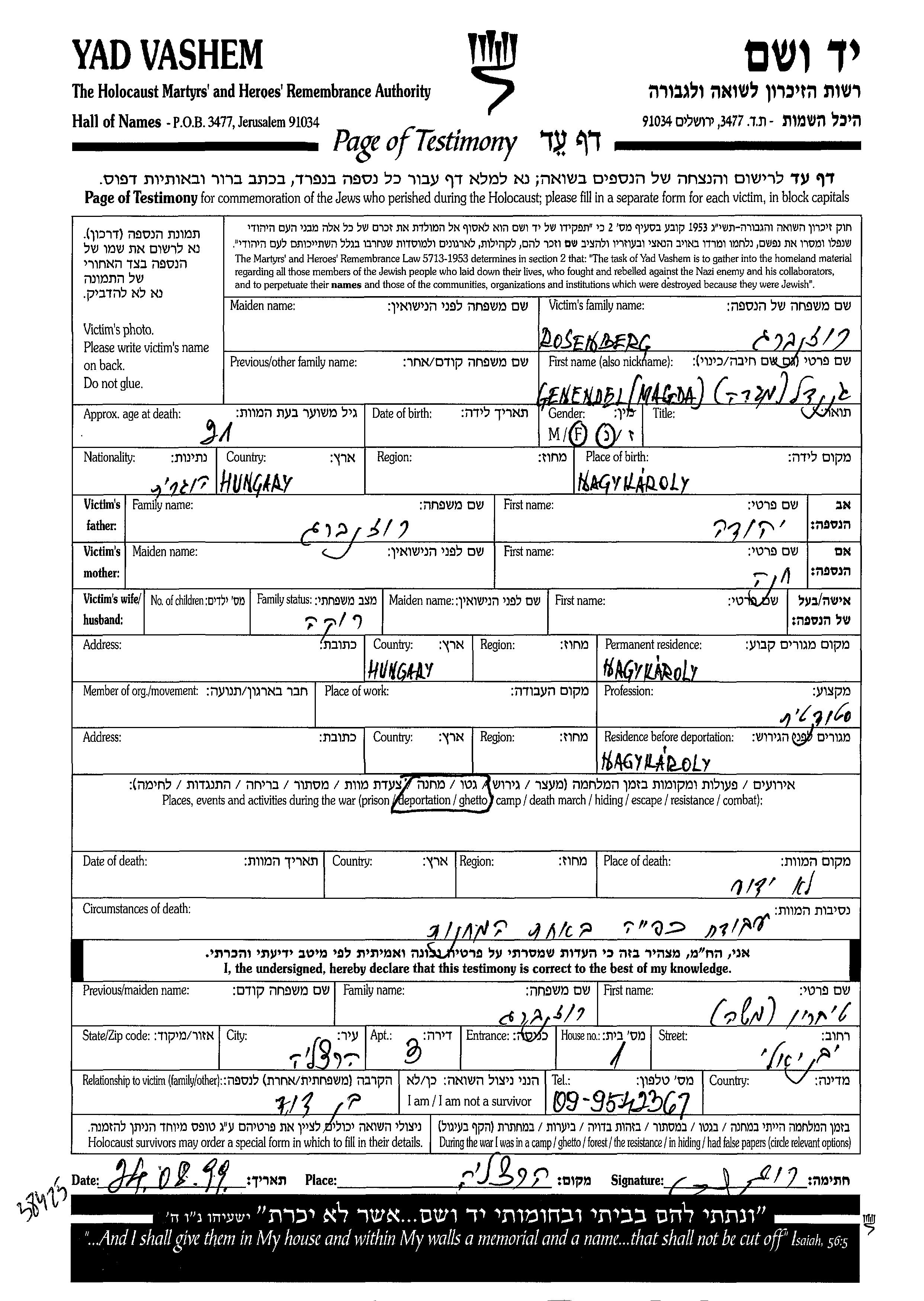 Rosenberg Genendel Magda Nagykaroly, Roumanie Feuille de témoignage